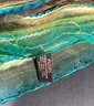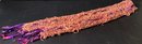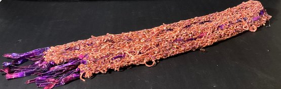 * the second scarf has been hand created in salmon pink chenille yarn that has a distinctly velvet texture. Woven in this scarf are royal purple silk ribbons that have silver metallic accents. There are also tiny silk squares suspended by black threading which add an extra kick to the scarf. Measures approximately 44” in length, not including ribbon fringe.