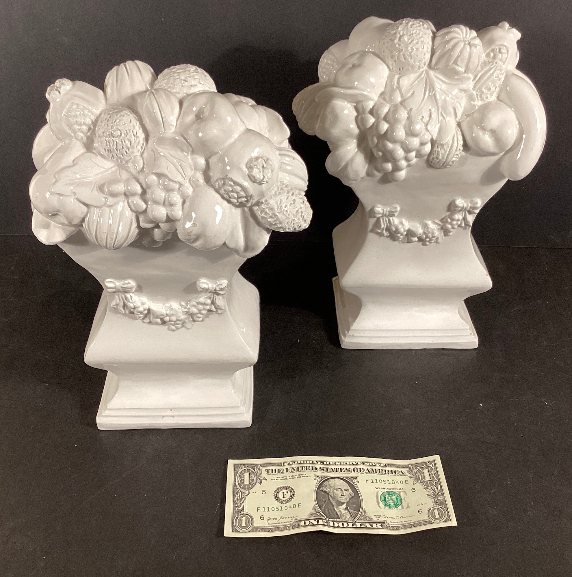 Each topiary has a high glaze that is quite outstanding. The ceramic fruit includes berries, pomegranates, grapes, pears, and bananas. The base of each topiary shows these have been made in Italy.