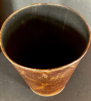 * the first wastebasket is the larger of the two. This is in dark brown leather with a velour interior. This waste basket has an 11”diameter at the top of the basket and an 8.25” diameter at the base. It is 14”in height.