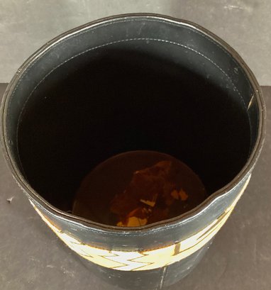 * the second wastebasket is tubular in design. This is made of a thick black leather with a material banded around it reminiscent of a bohemian look.