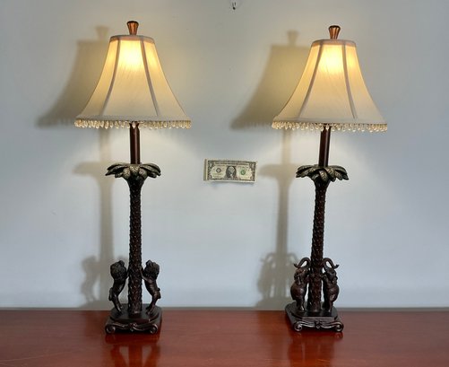 One lamp has two lions with their heads pointing upward towards the ‘leaves’, and the matching lamp has two elephants in the same pose.