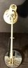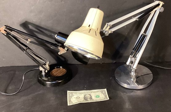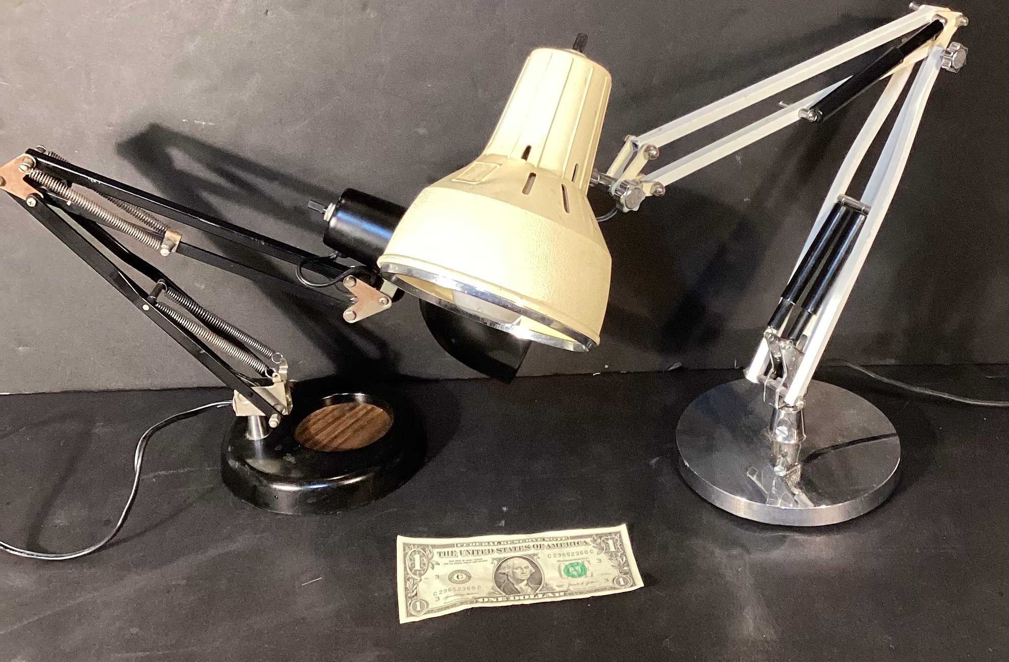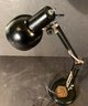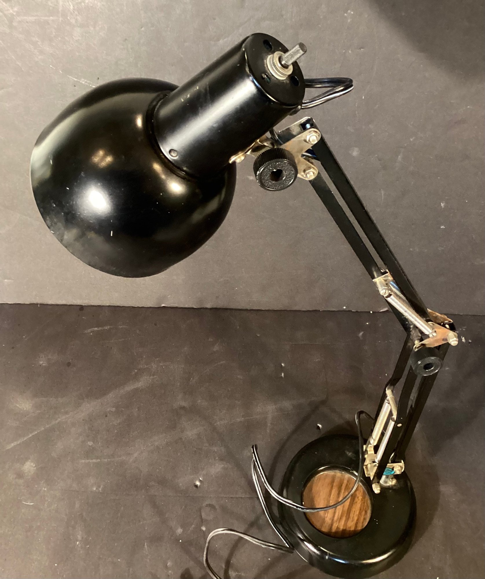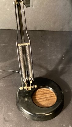 * black architect desk lamp with black cord. Lamp is 4” in diameter, and base is 5.5” base. Spring and metal arms. Each arm is 9” full extension is 18”.