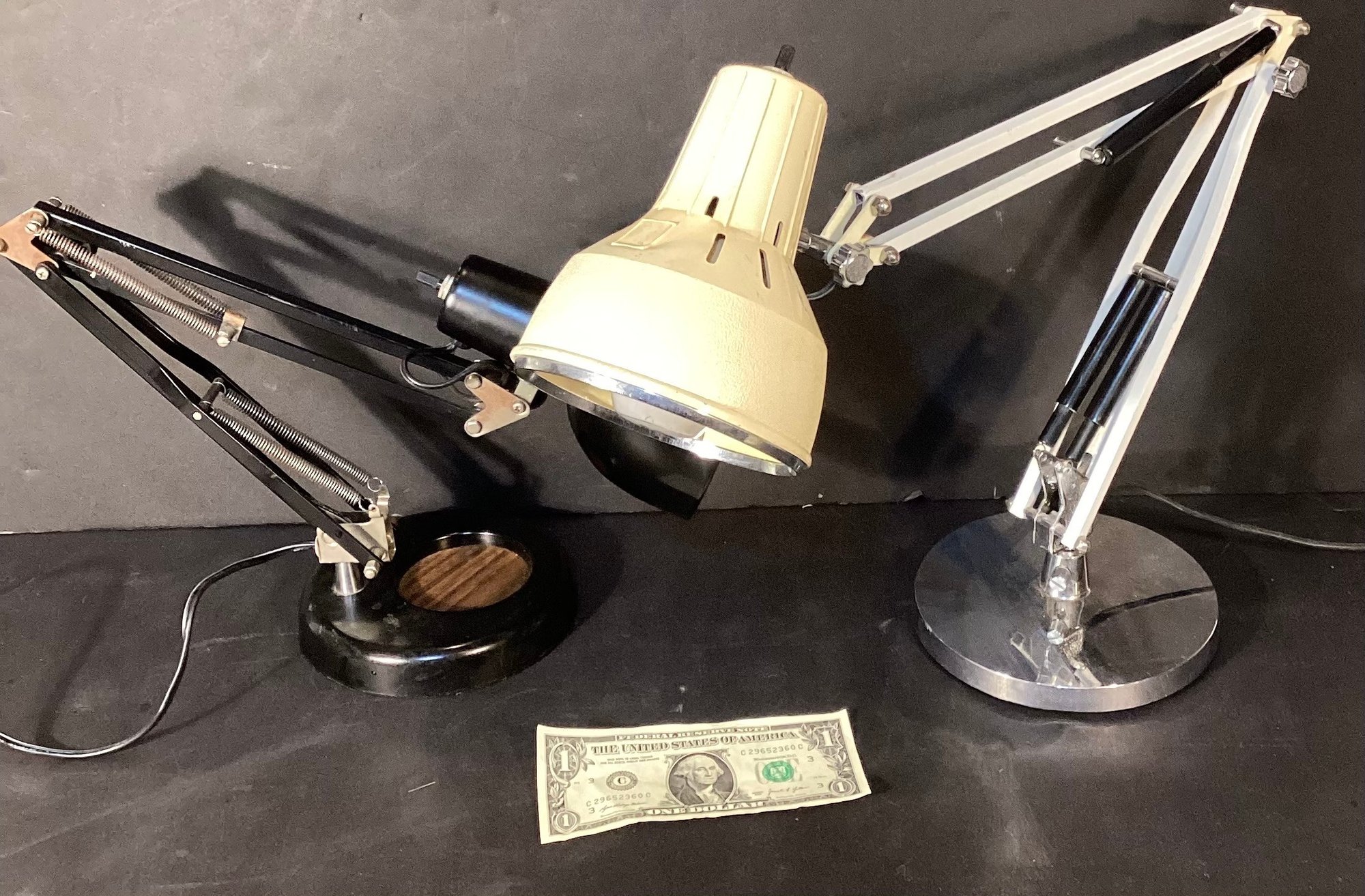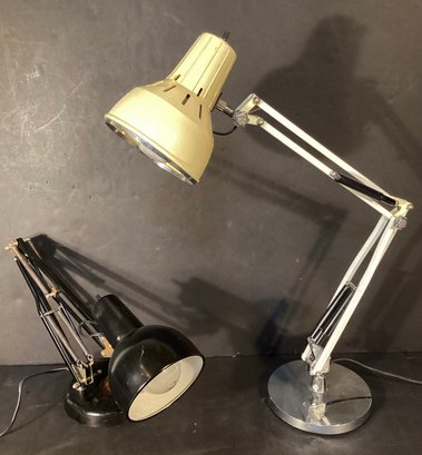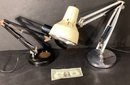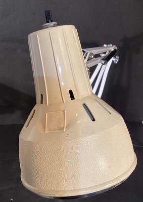 * white clamp architect lamp by Luxo, with white cord. Spring and metal arms. Lamp diameter is 7”. Each arm is 15”, with full extension is 30”. Black clamp.