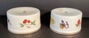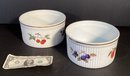 * the second soufflé dish is the larger of the two is 4” in height, and 7.5” in diameter. As with the first piece has ribbed body, a gilded band, with lemons, cherries,elderberries, and a nectarine. No cracks, chips, or breakage.