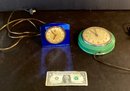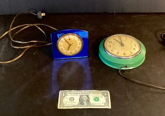 * the second clock is a desk model by the General Electric company. Has original wiring that has been tested and does work. Again the purchaser is advised to have this checked by electric professional. Has the classic art deco blue glass surrounding the clockwork itself. Has an alarm setting. Measures 5” x 5”.