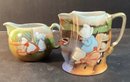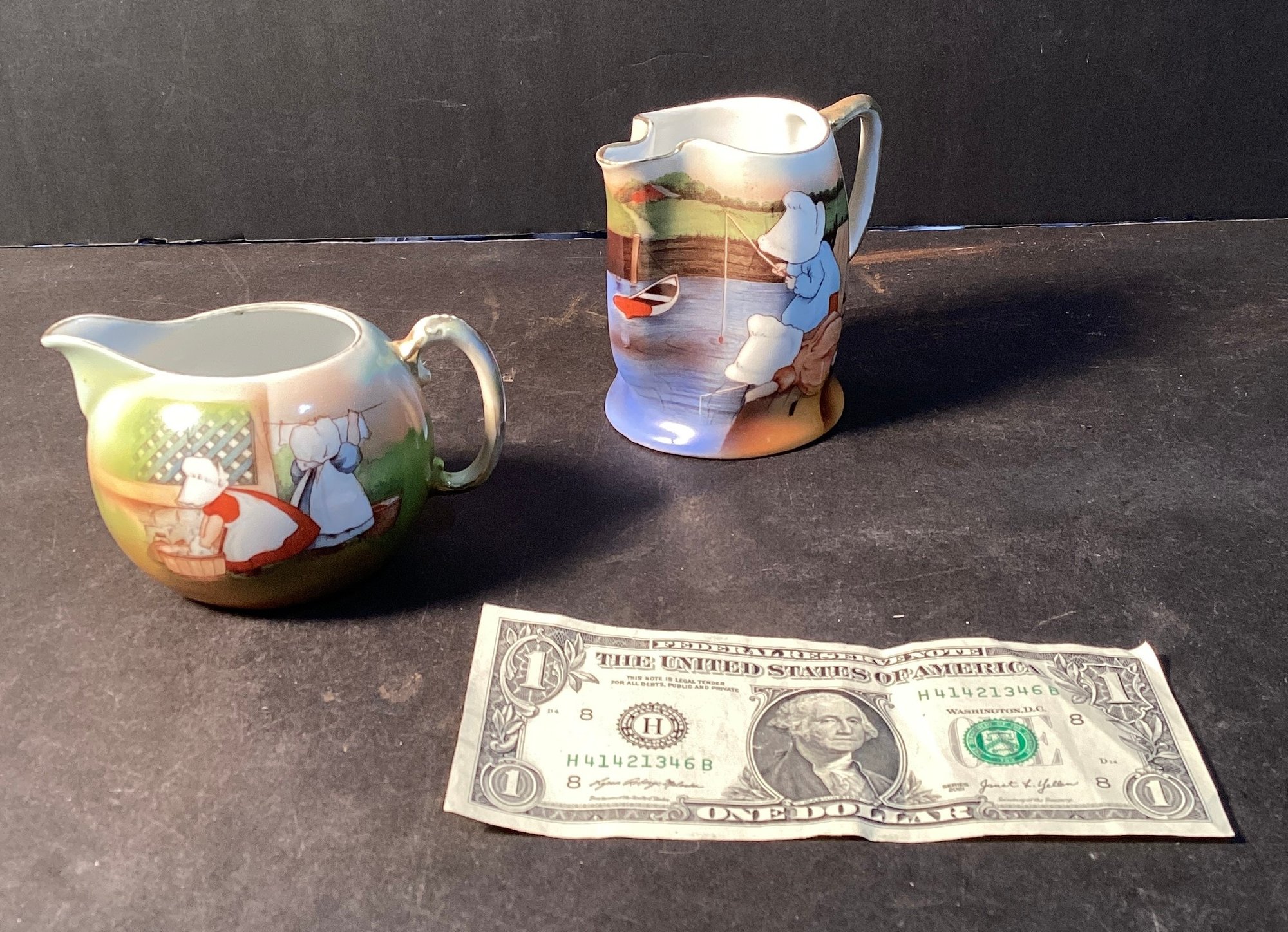 * the smaller cream pitcher has the two girls doing laundry. This pitcher is smaller and rounded measuring 3” in height.