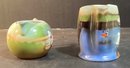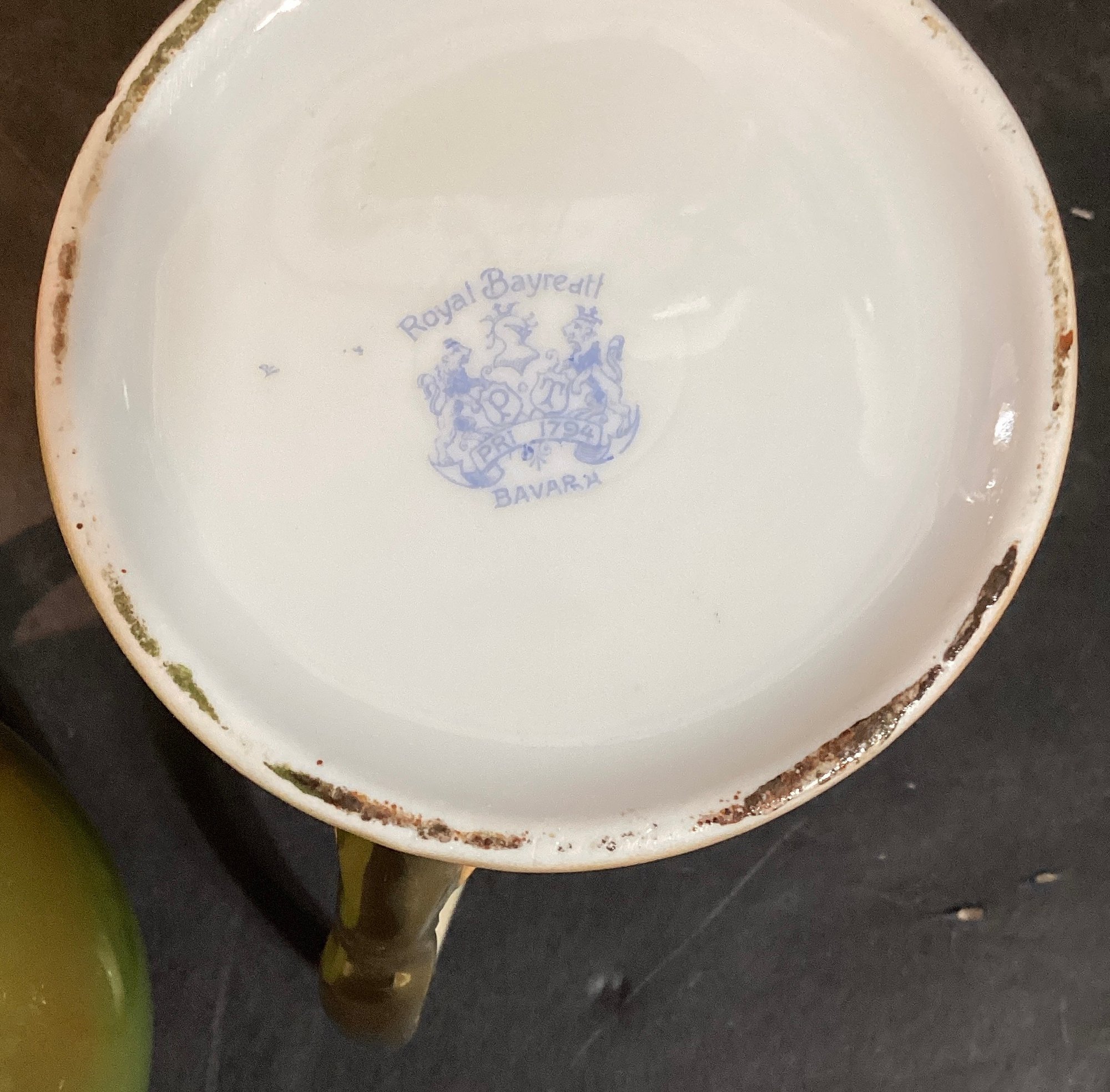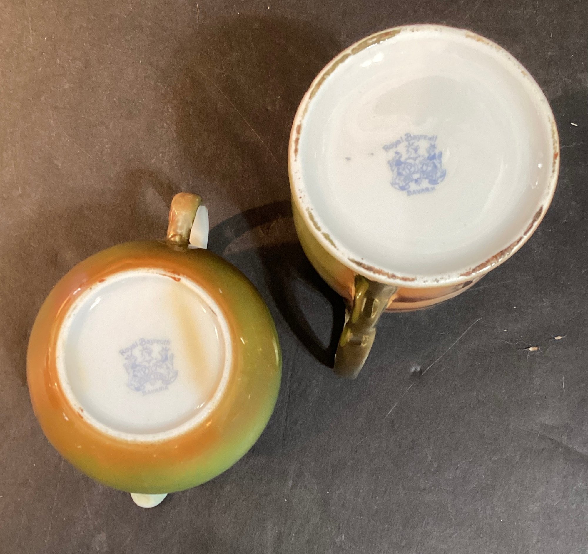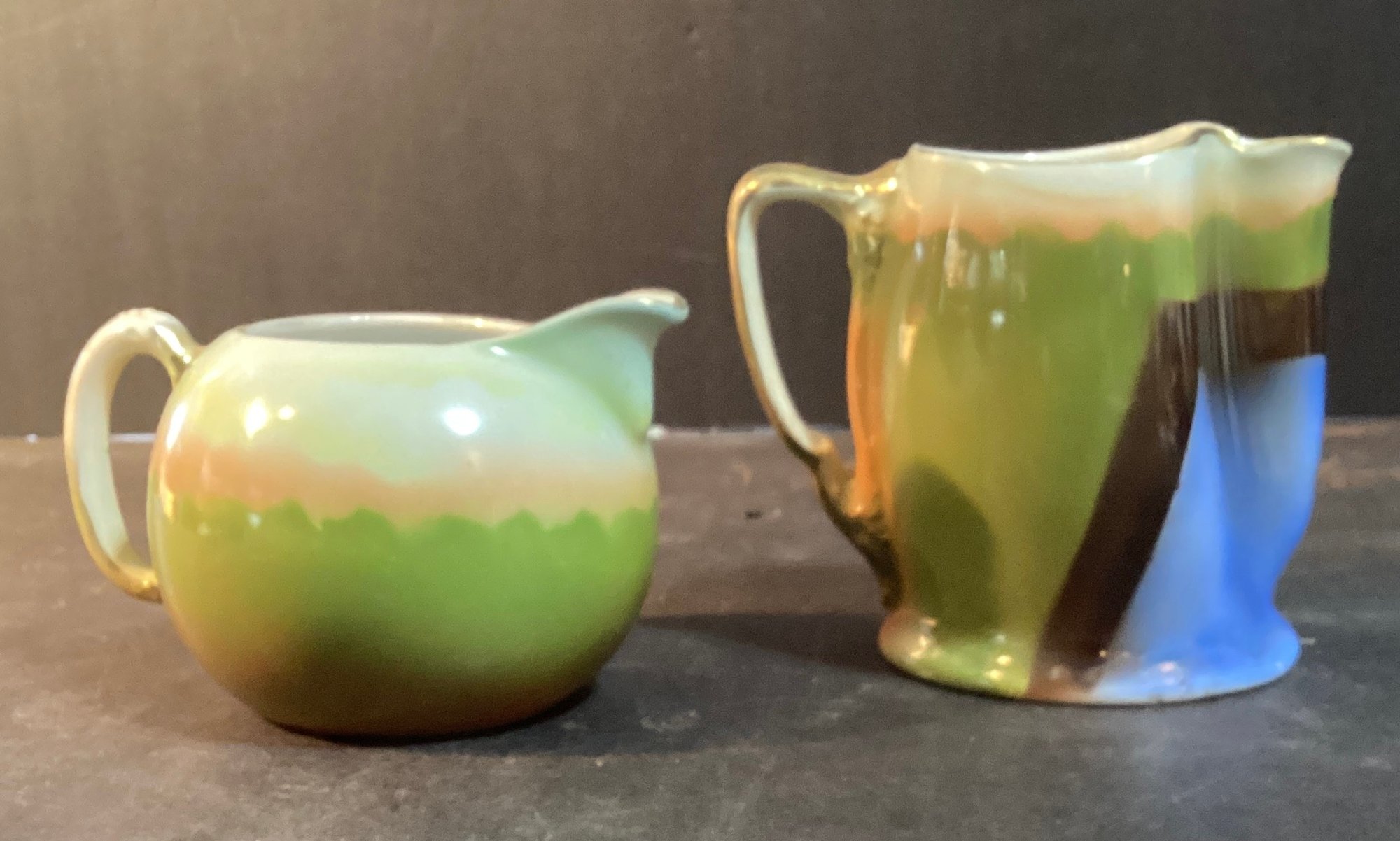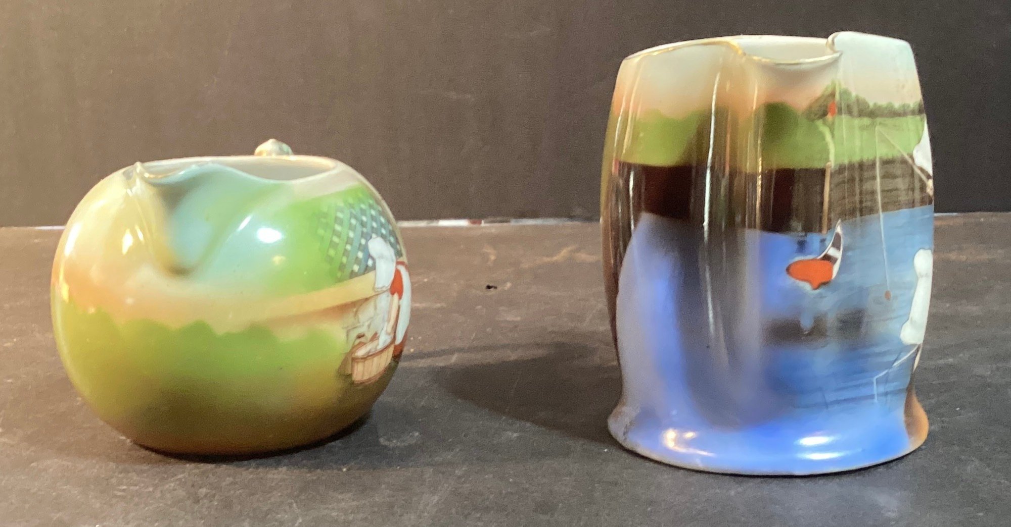 * the taller cram pitcher has the two girls fishing. Hasgilding on handle and edging of pitcher. Measures 4” in height.