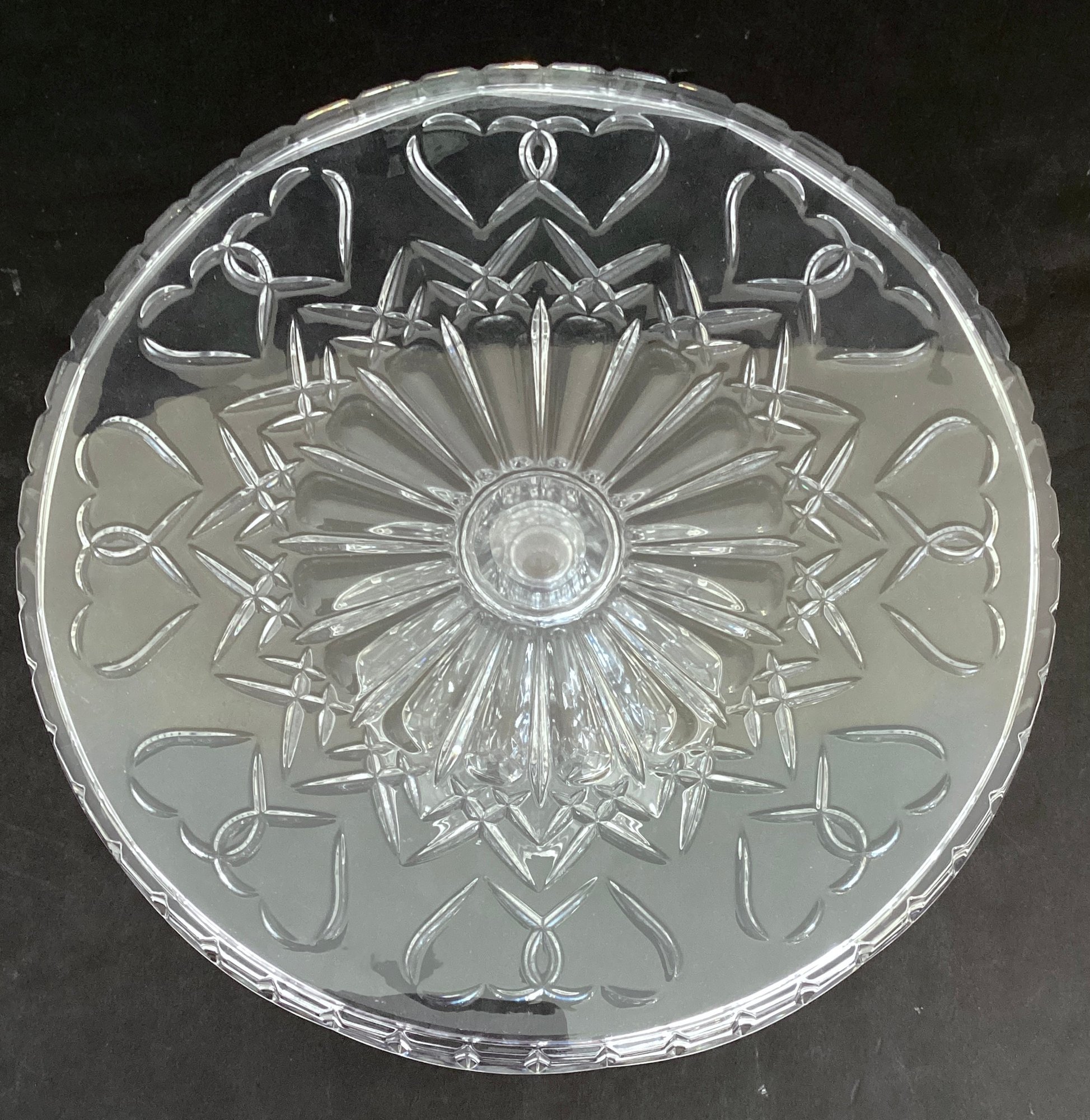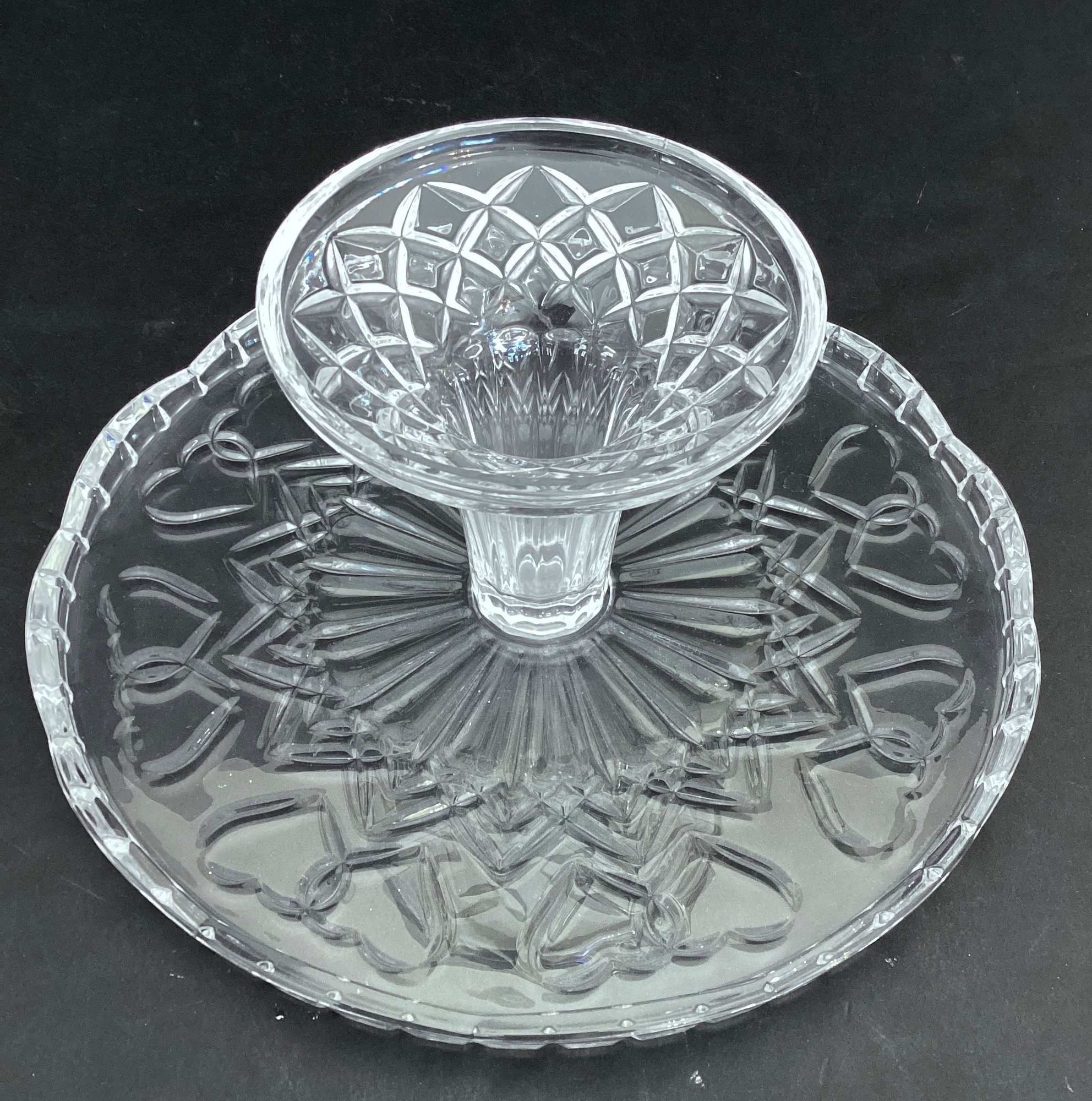 * the smaller cake stand has a radiant center pattern with double heart pattern around the edge of the stand. Measures 5” in height x 1” in diameter.