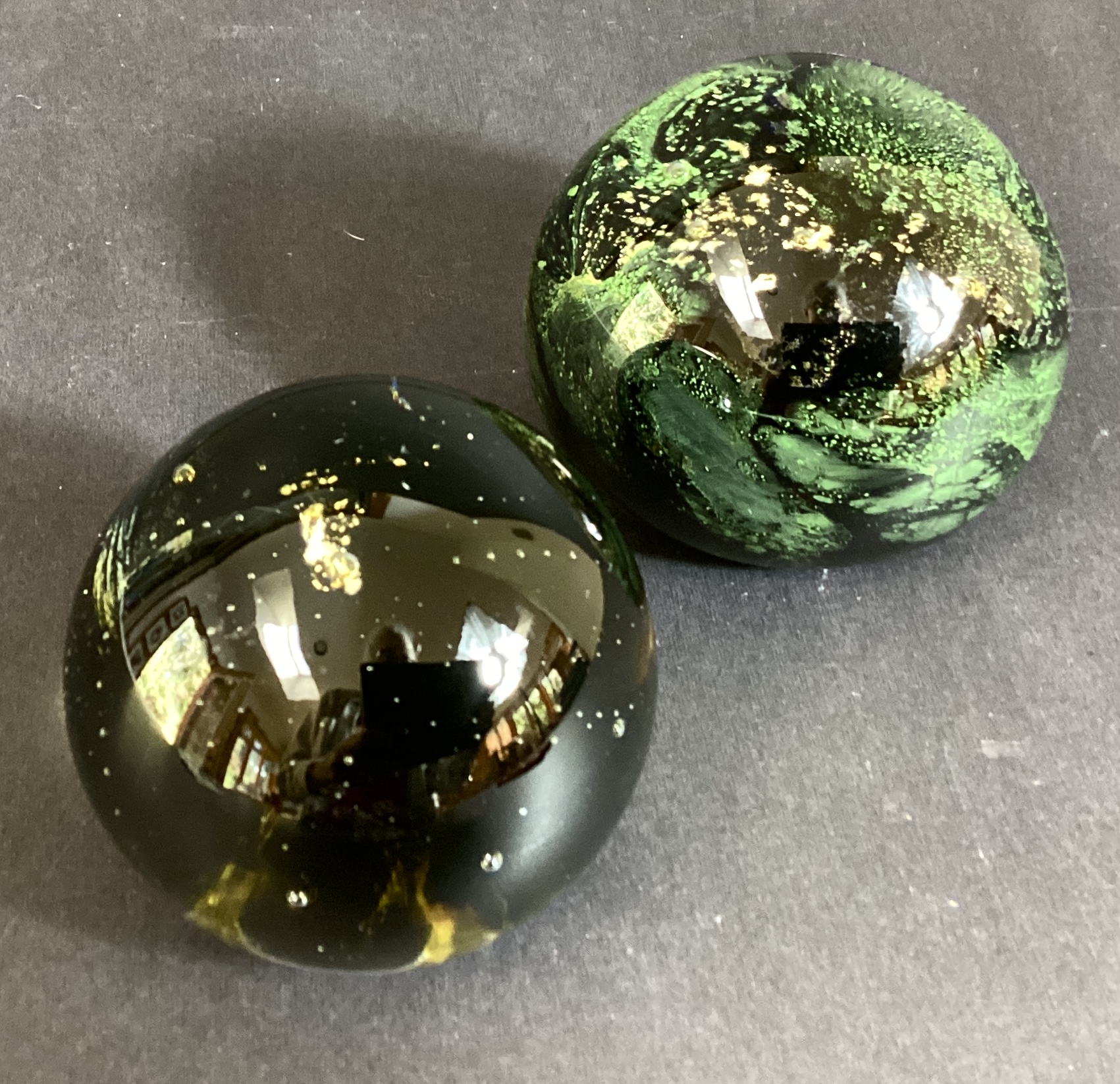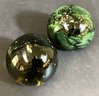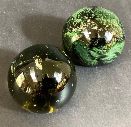 * The second paperweight is also an internal color of gold-brown with an overlay of green and gold leaf in an abstract pattern. This is signed by the artist, and is 3.00” in height and 3.50” in diameter.