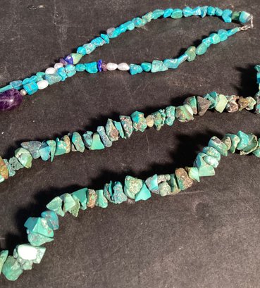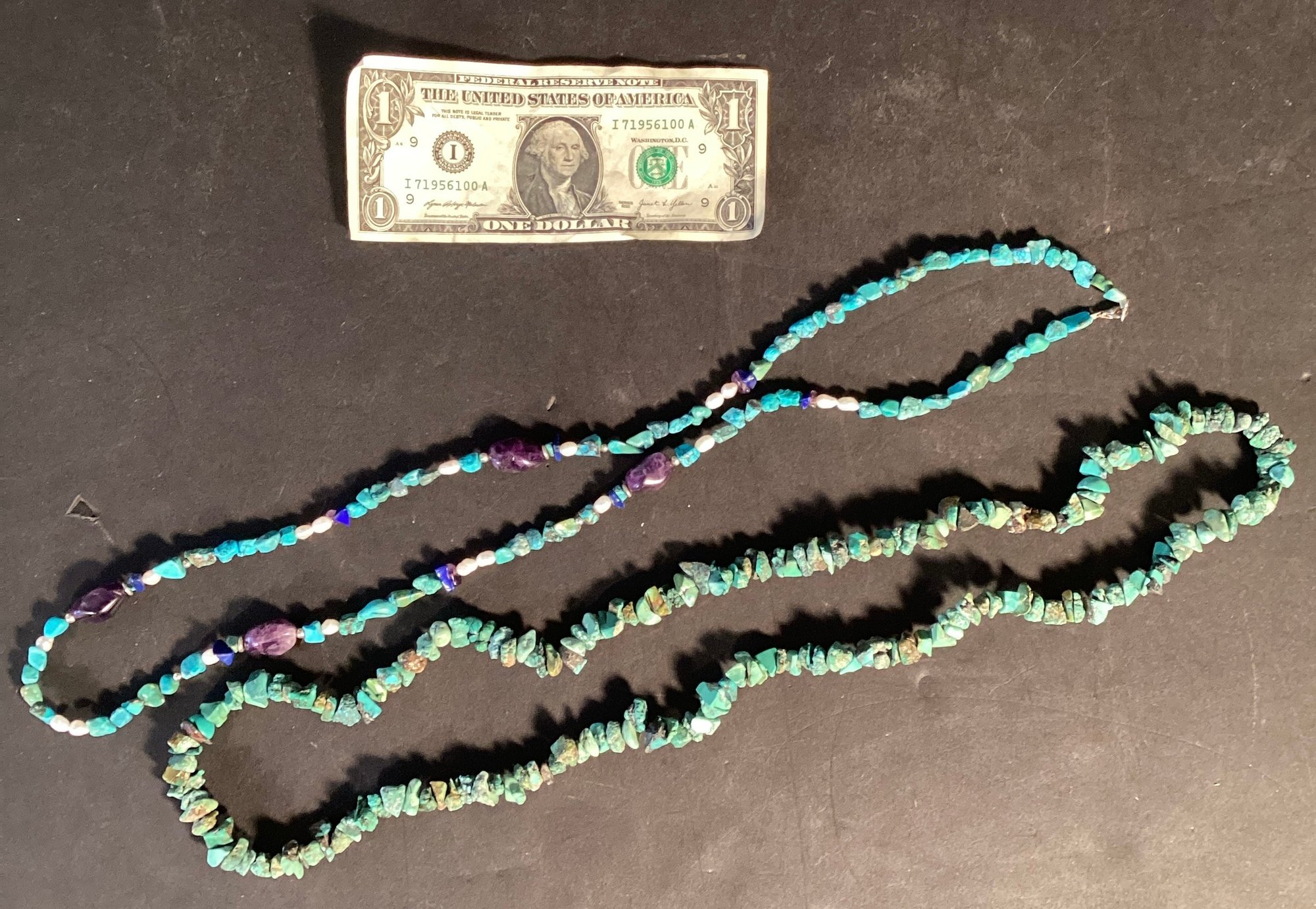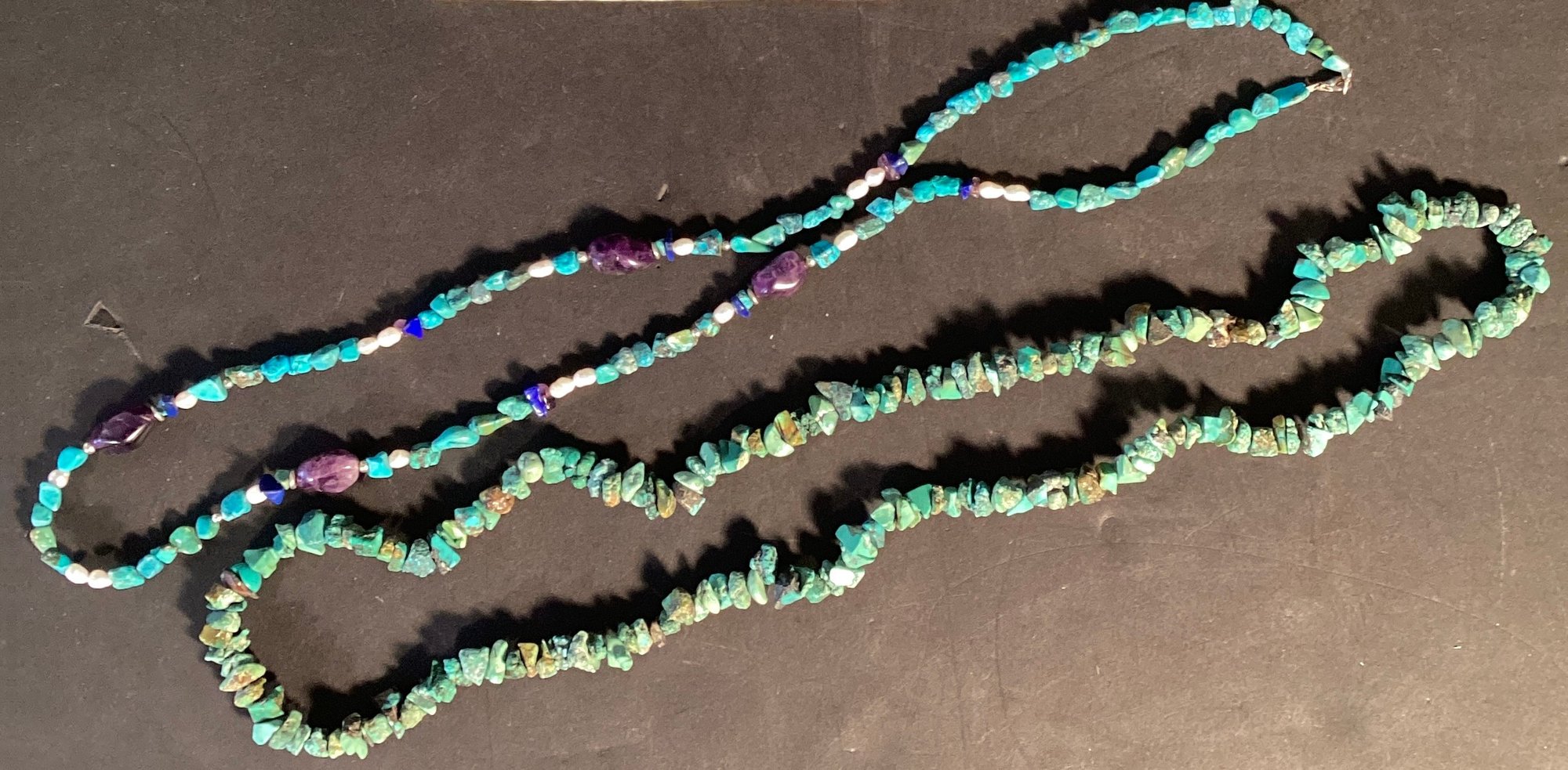 * the first necklace is a 30” length with no closure. The chips are in a variety of turquoise tones and shapes.