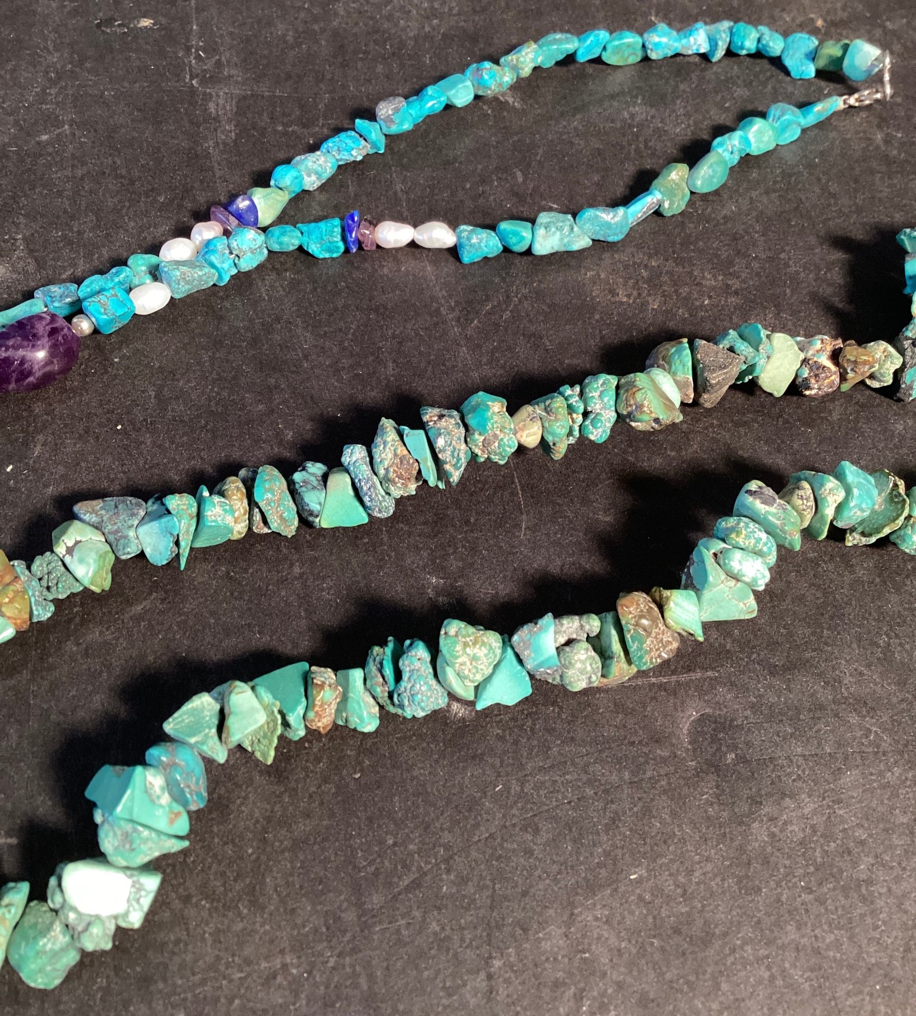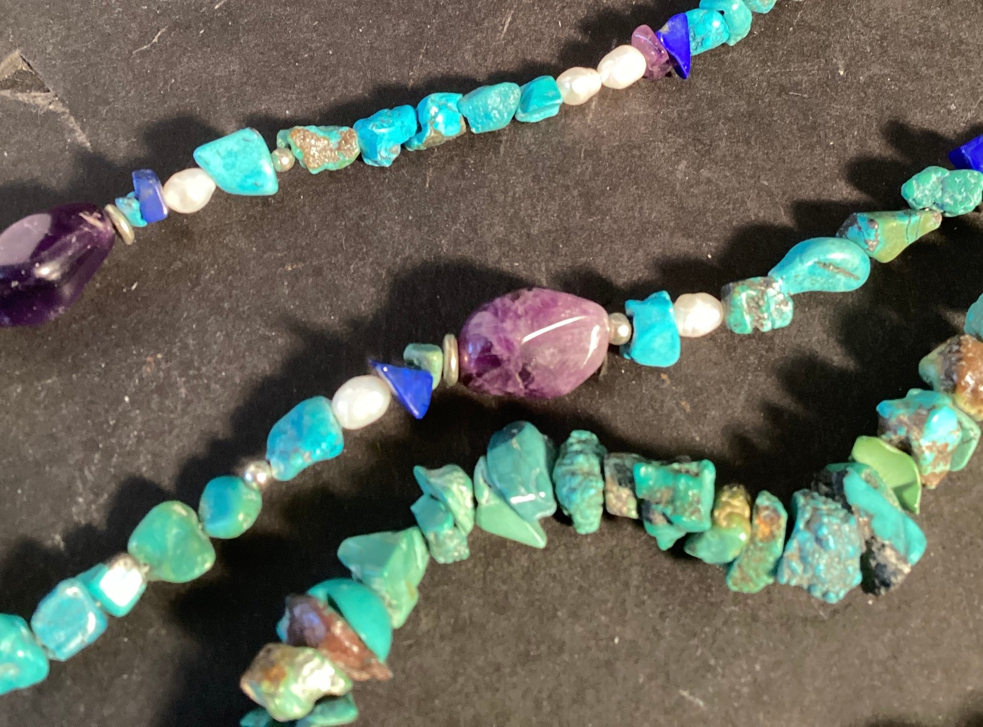 * the second necklace is approximately 34”. This necklace has a variety of enhanced toned turquoise hips, freshwater pearls, amethyst beads, and sodalite chips. The necklace has a silver lobster claw closure.