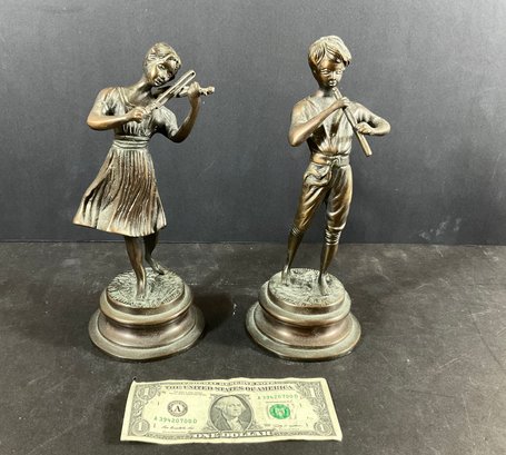 Classic cast bronze figures a boy and a girl playing a flute and a violin excellent condition. Nice patina. Made in the 20th century.