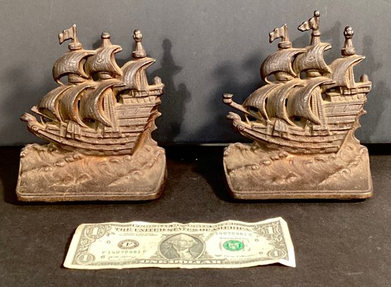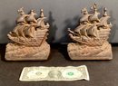 * each bookend has an elaborate sailing ship that has been designed to emulate the boat sailing on turbulent waters.