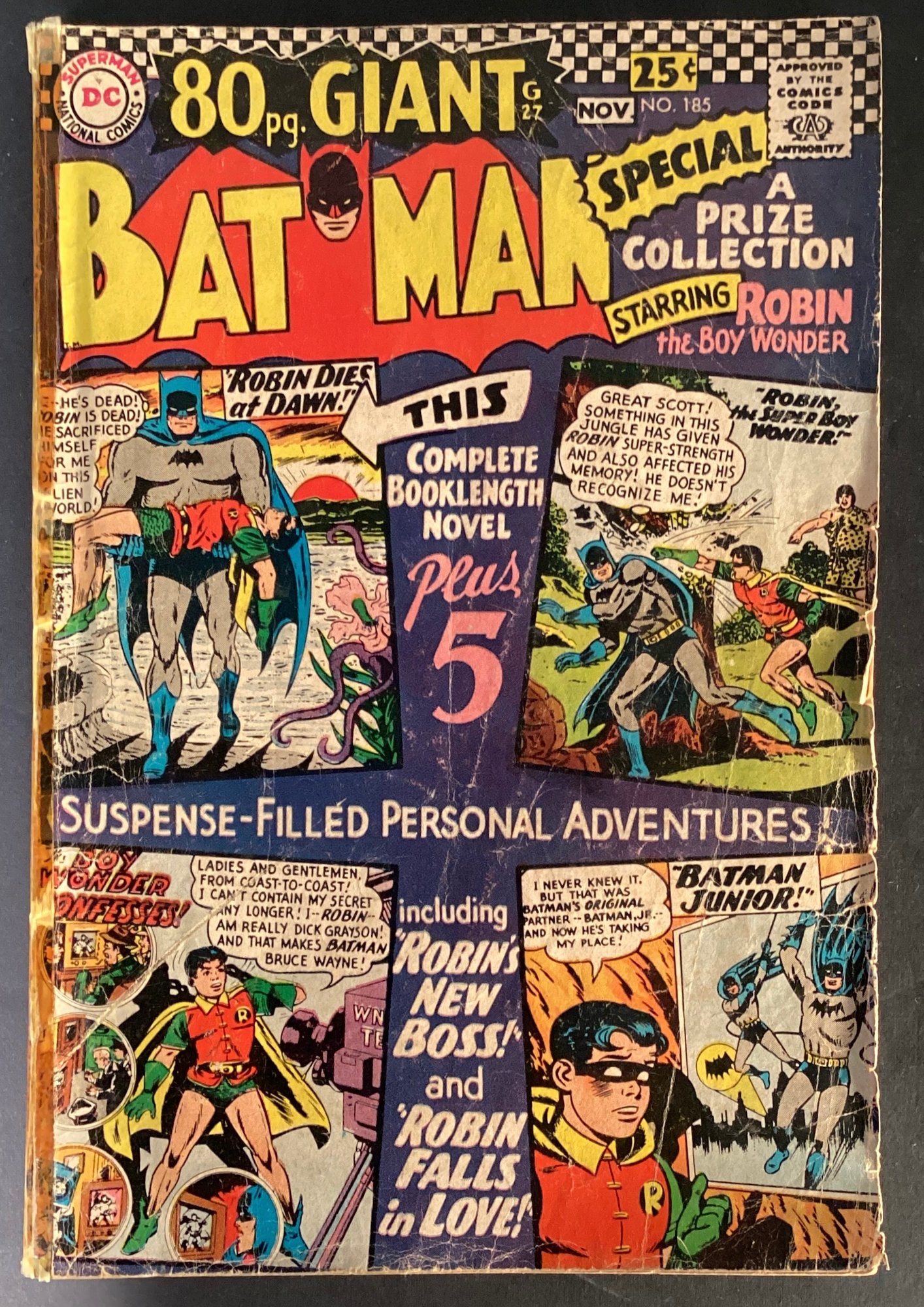 * the second is a 25 cent/80 page ‘giant’ Batman special edition starring Robin, the boy wonder. This is a Nov. no. 185 edition, issued October 1966.