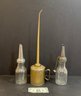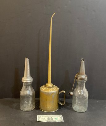 We are selling two antique oil bottles and an antique railroad oilcan made by Eagle manufacturing. The bottles have some inscription then suggest it has been approved in three different states for use back in the early 1900s. One top has a cover. The other top is missing three hard to find items.