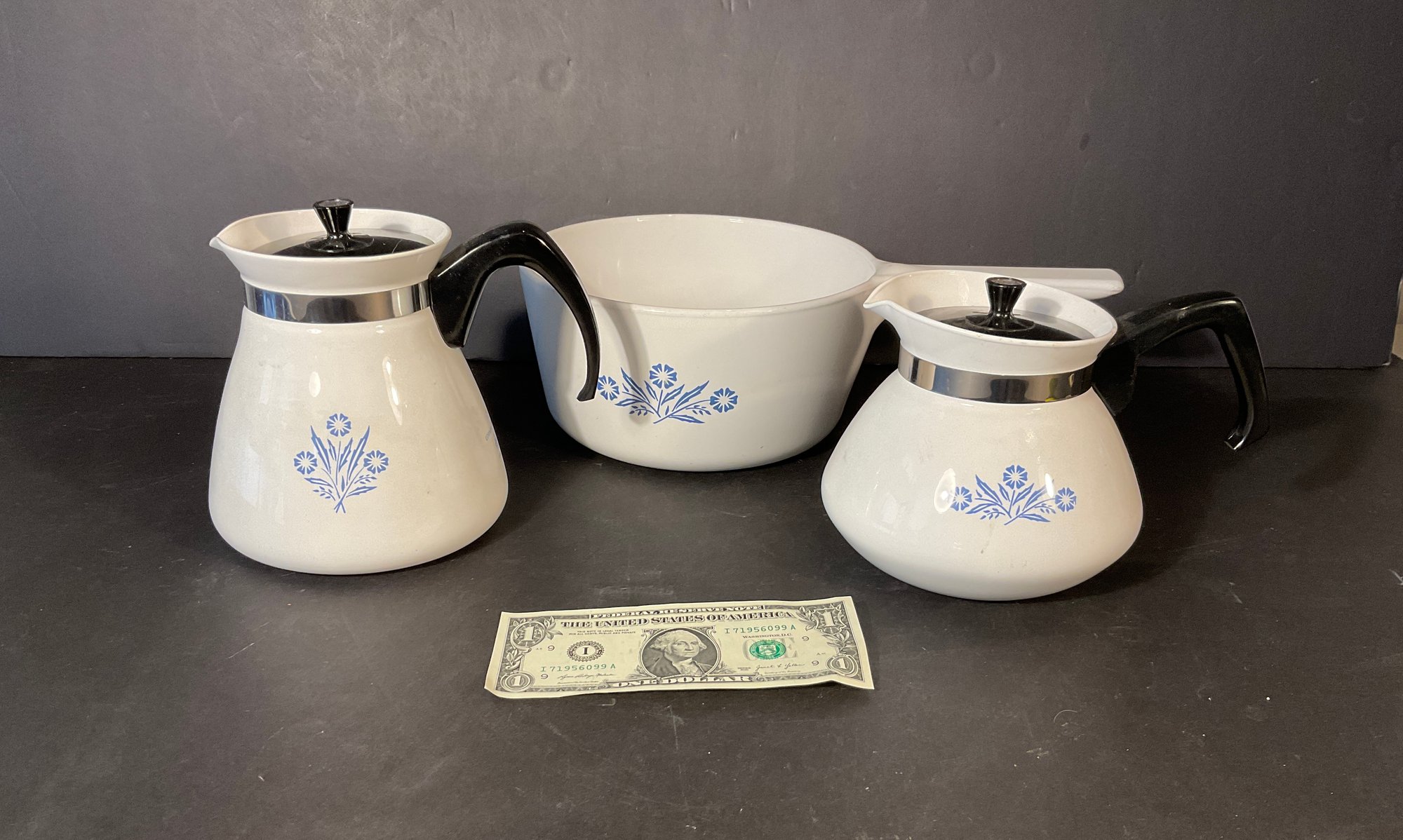 All three pieces are in very good condition. The 2 quart sauce pan is a stove topper, and the coffee pots are all clearly marked