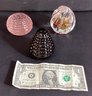 * A light rose water pink paperweight that is textured in the same manner as the root beer textured paperweight. This paperweight is 2.00” in height and 2.50” in diameter. This is signed by the same artist.