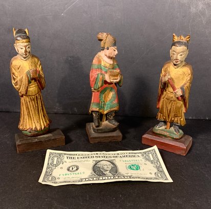 Nicely carved and painted wooden Chinese figures on carved pedestals. Nicely painted and gilded. Several small breaks and wood. Please see pictures for more accurate description.