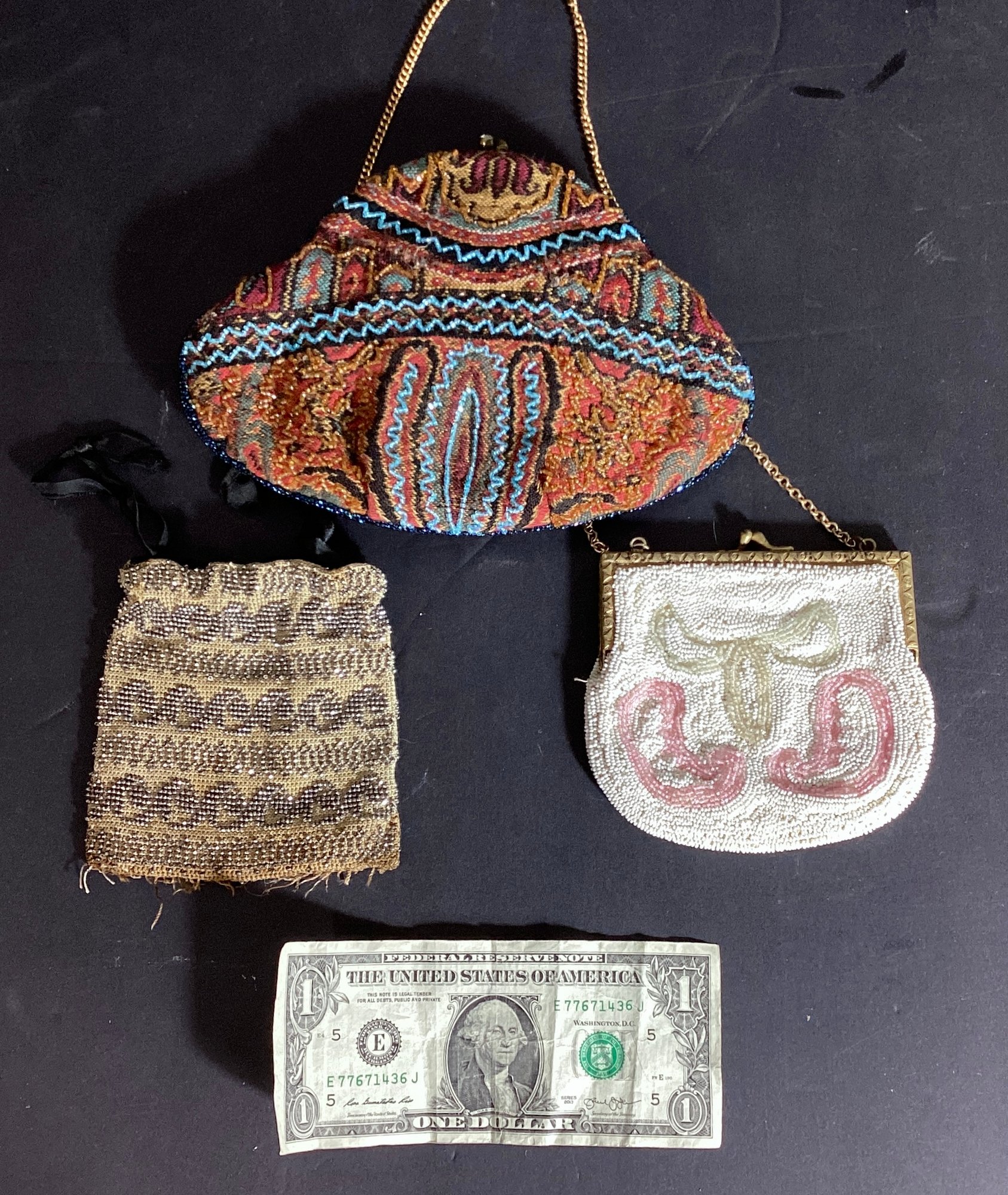 * The first is a hand made beaded drawstring purse. The material is a tea colored fabric with a hand beaded motif made of tiny glass beadwork reminiscent of marcasite. The interior is made of black silk with a satin drawstring. This purse measures 4.25” x 4.00”.