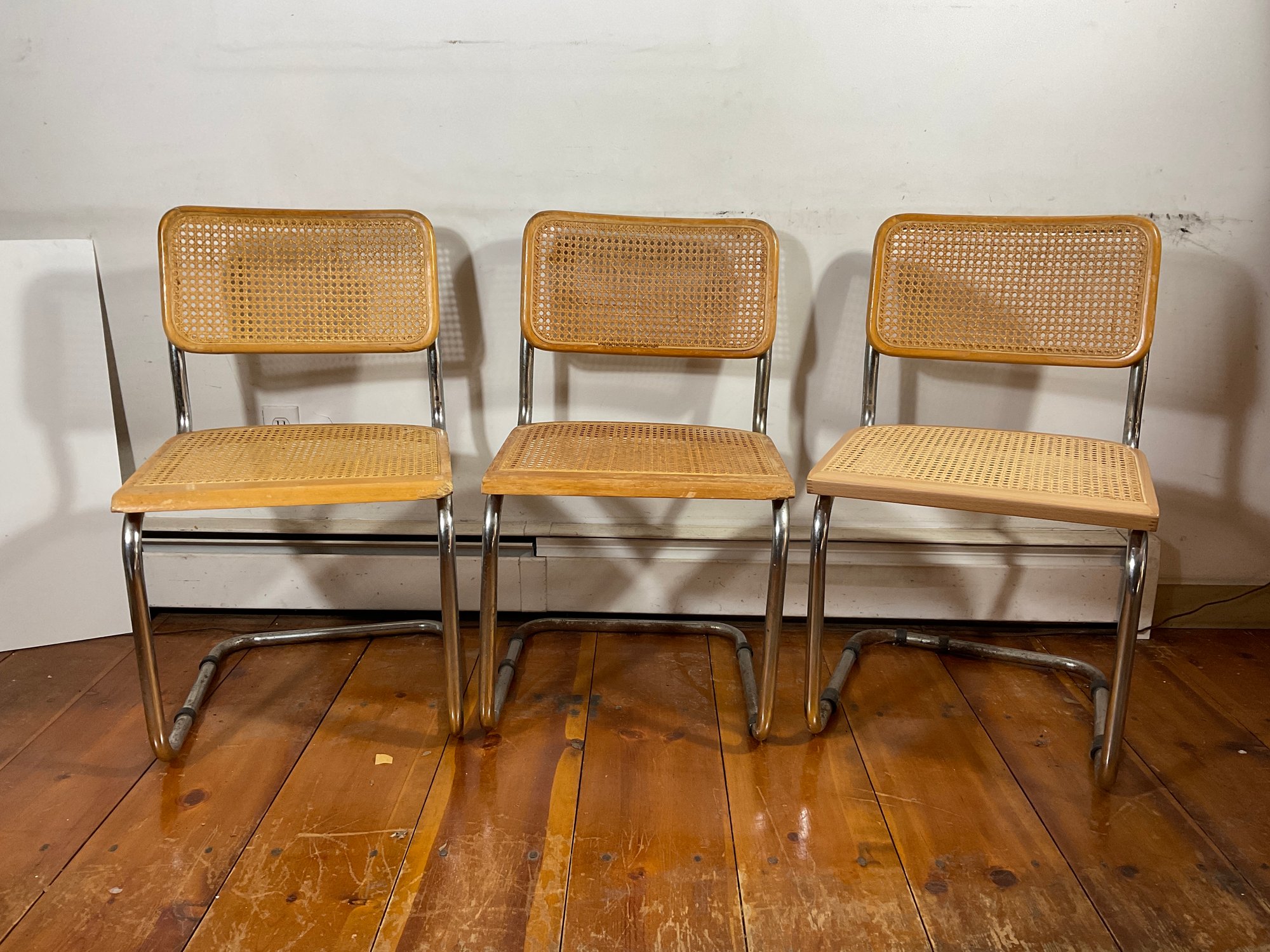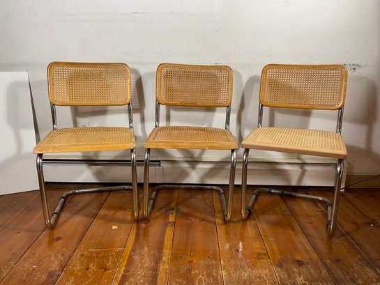 Three good quality side chairs .An originally designed by Marcel Breuer. Age appropriate, where the tubular steel frames need to be cleaned.