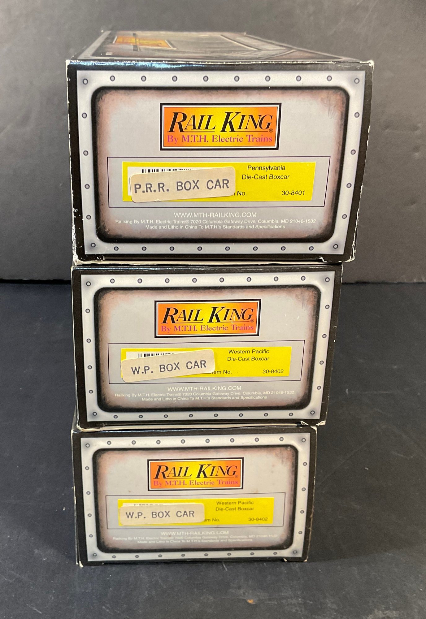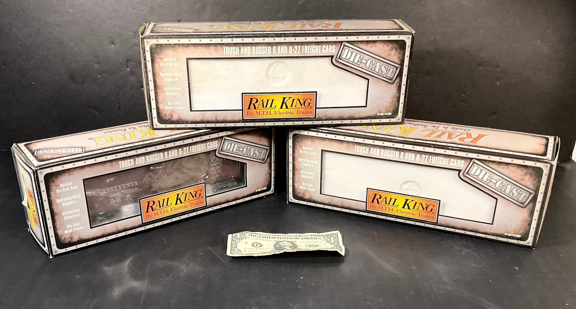 All three box cars are new in the box still in the plastic with the original warranties. These are old gauge and they are diecast. Very good quality and great condition. Boxes are in pretty good condition as well. See pictures for they are part of the description.