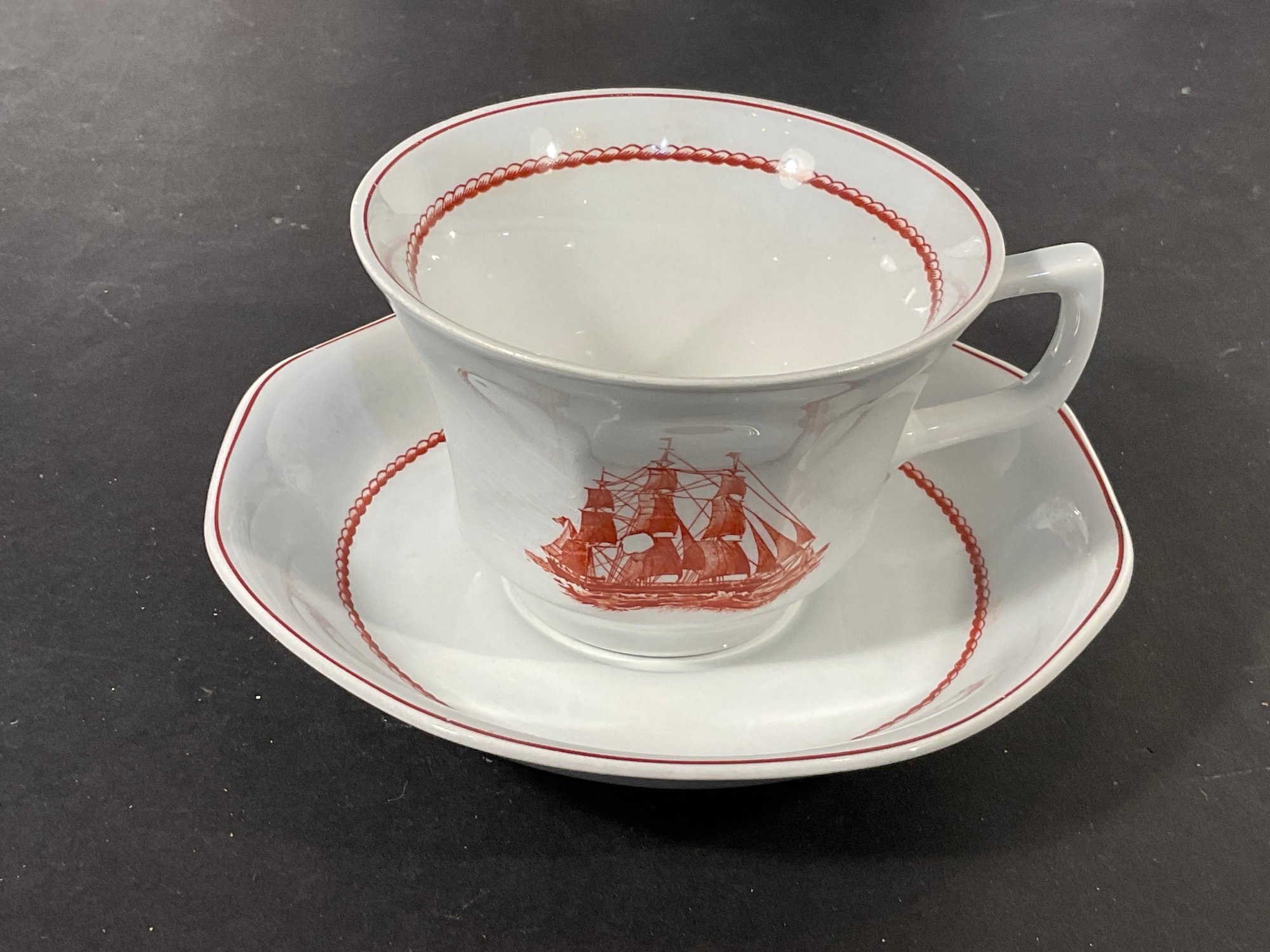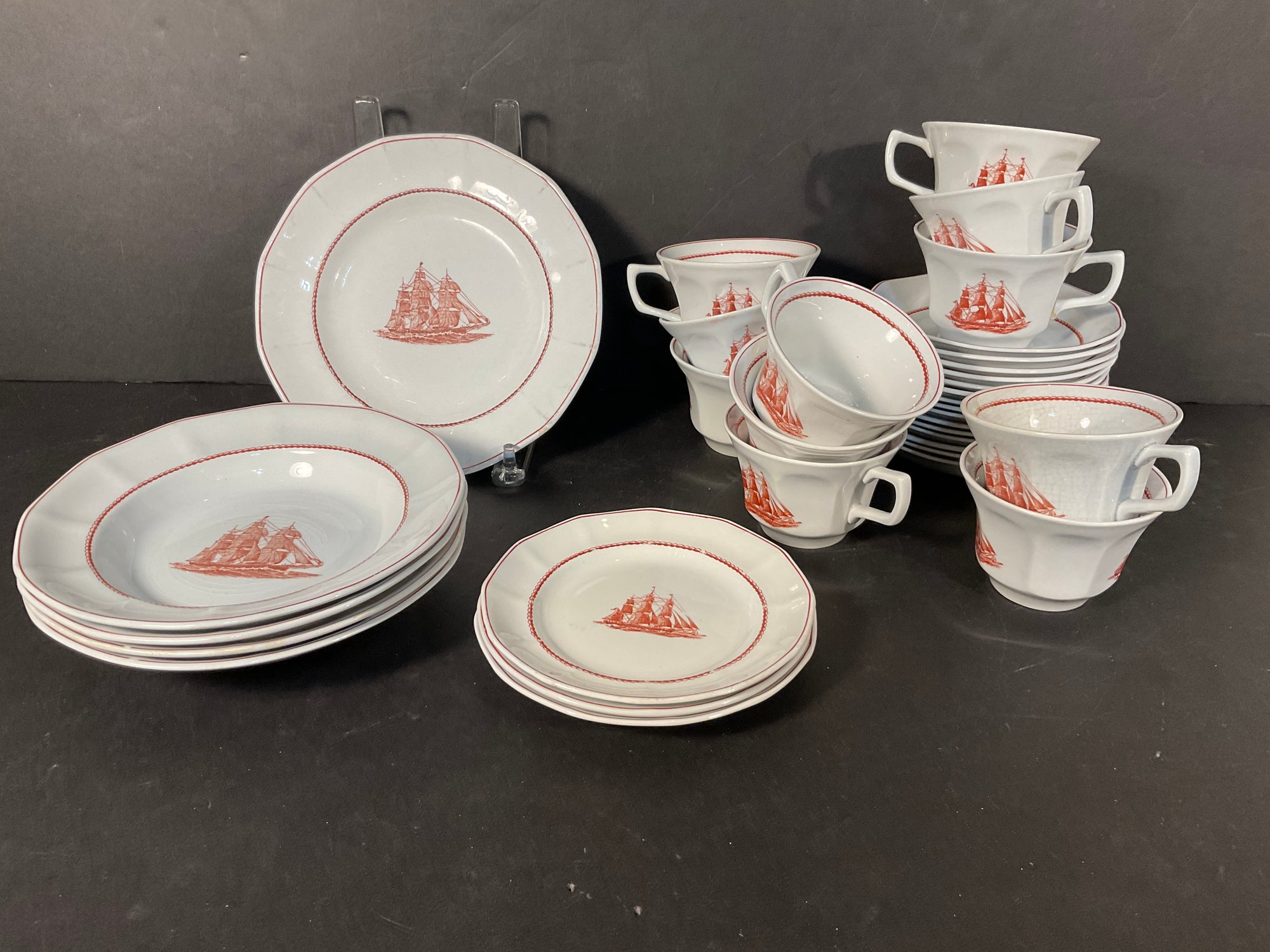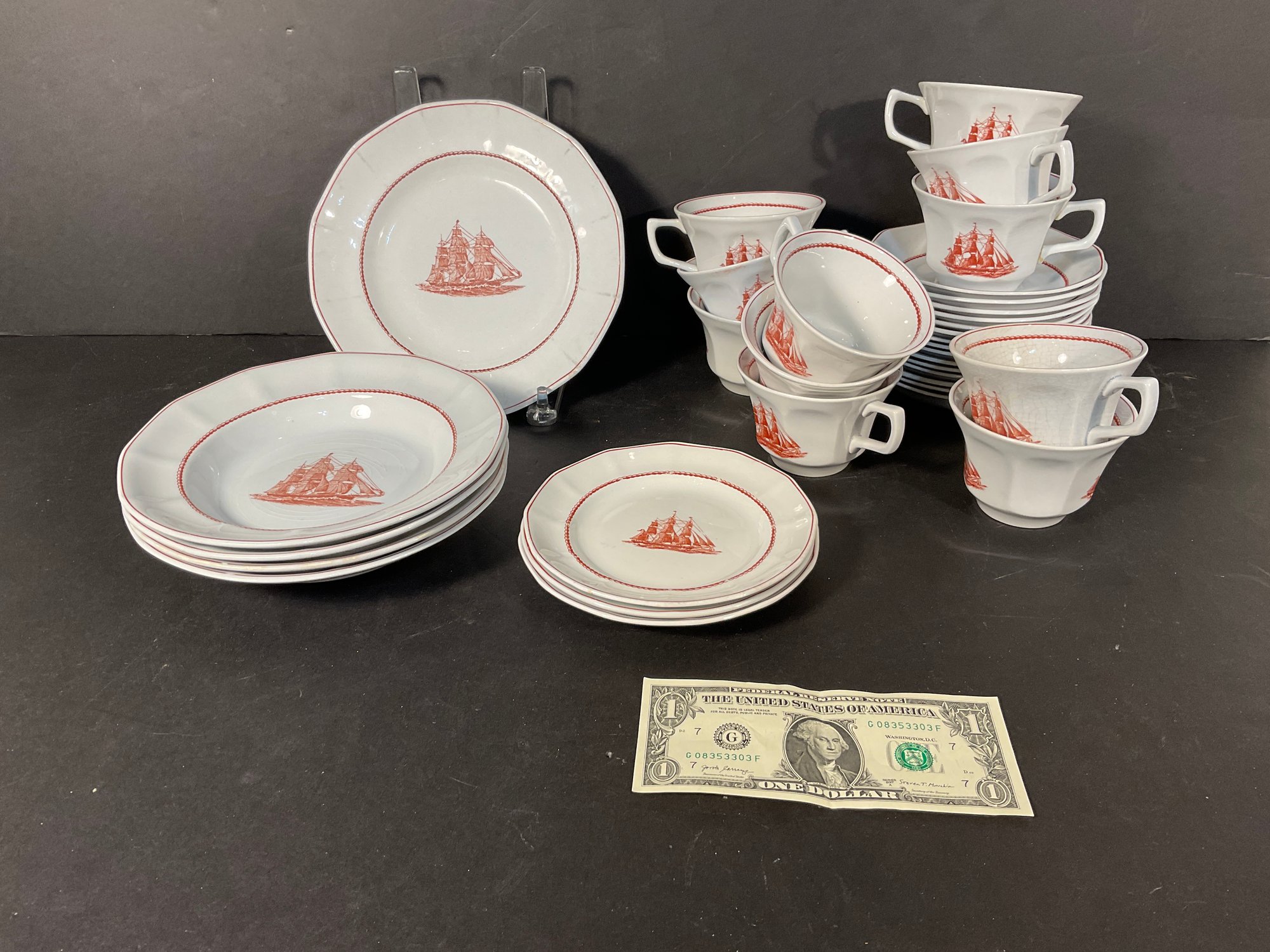 we are selling 33 miscellaneous pieces of fine Wedgewood Irland, Delaware. This is the red flying cloud pattern. All pieces are in good usable original condition.