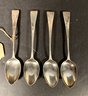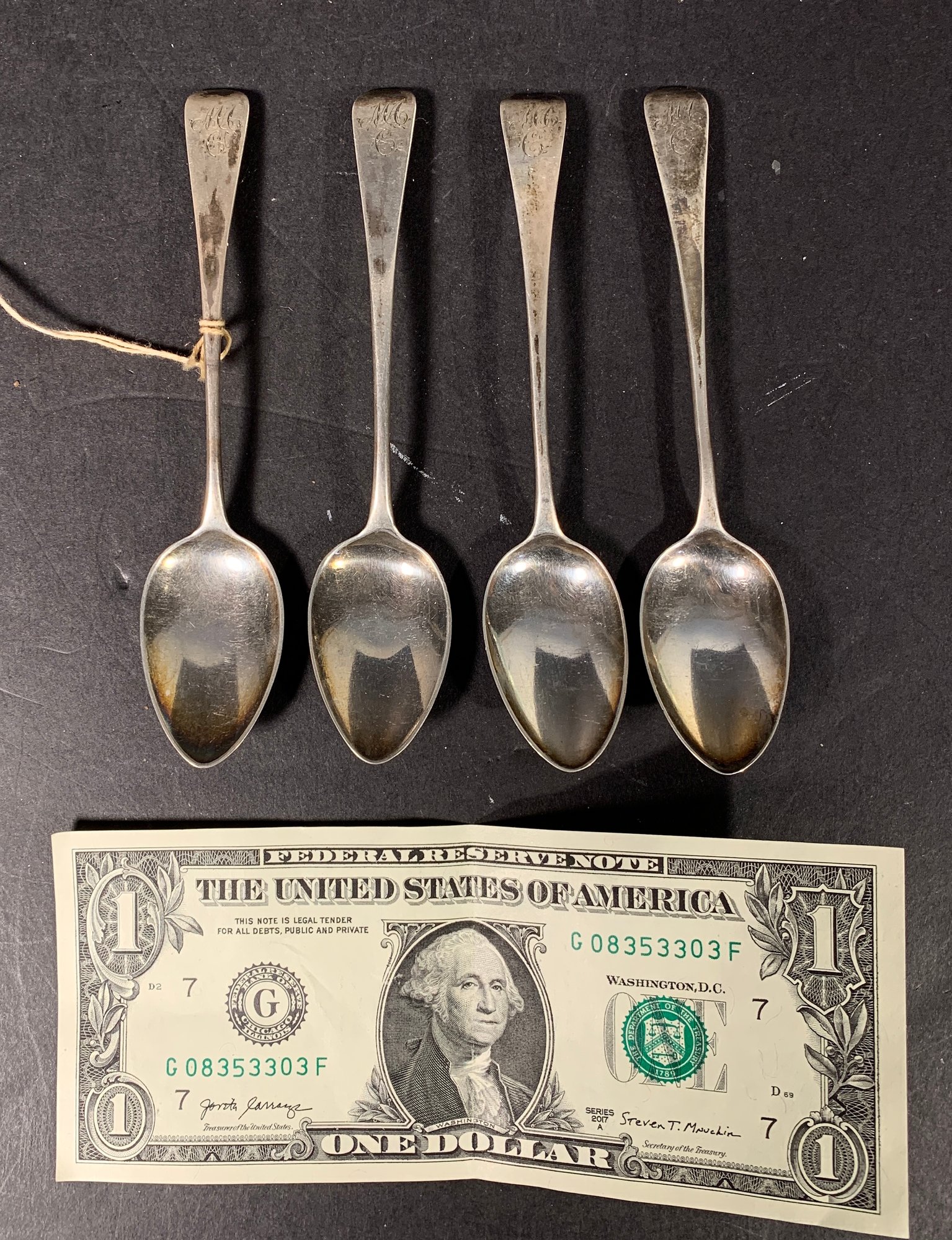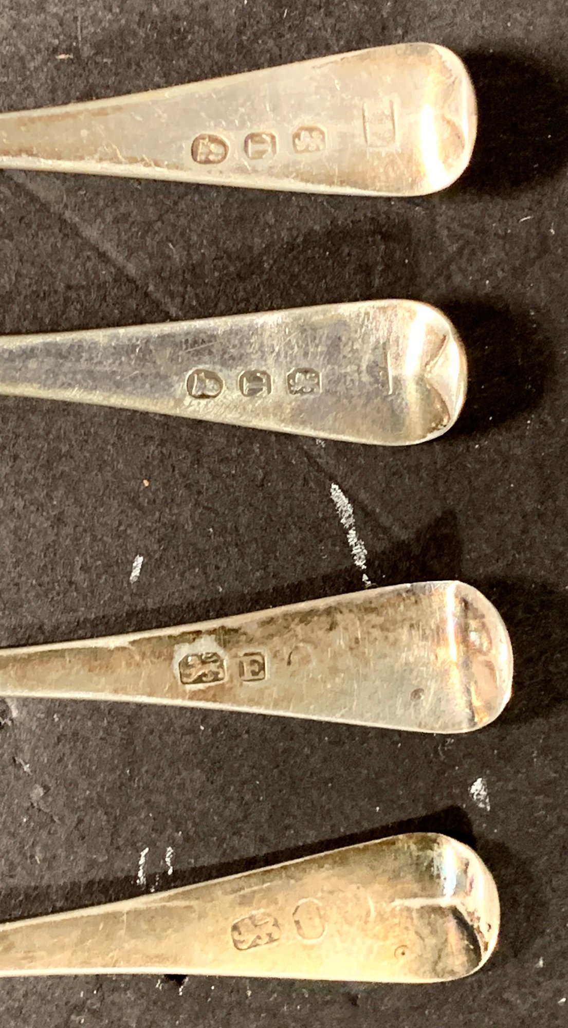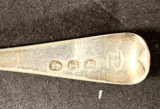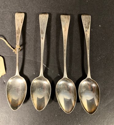 Pseudo, English marks some of them are very clear others are not very well-made, small teaspoons coin, silver. Classic, fiddleback design with bright cut monograms. All need polishing.