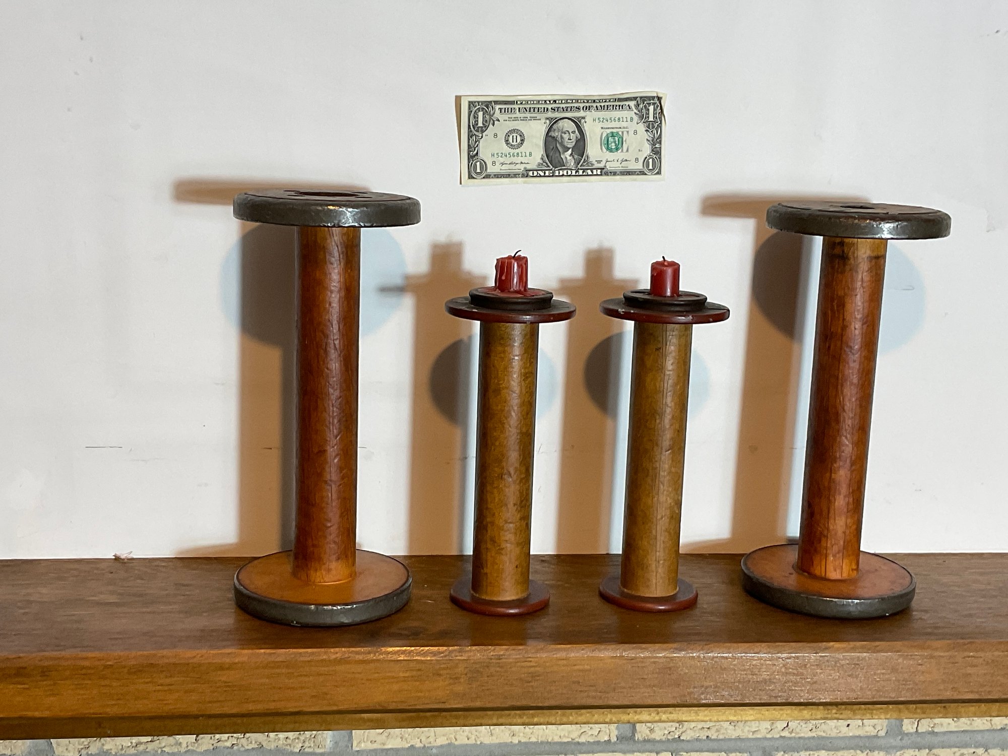 In the 1800s there were hundreds of mills throughout New England producing fabric threads and other decorative cloth items. The Mills had huge machines which they loaded of thread onto, when the Mills collapsed the machine was sold and things like thread spools were sold and used as candlesticks. Great old look a piece of history.