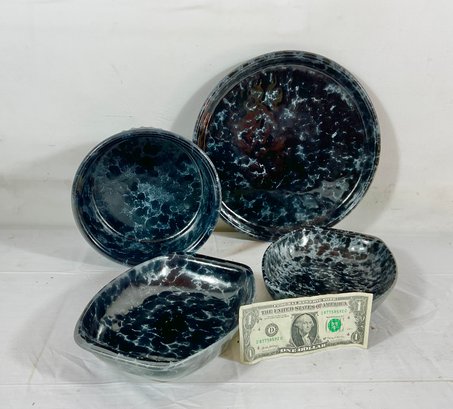 4 pieces of signed Bennington pottery serving items in dark blue mottled finish