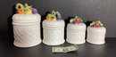 Here are four standard size kitchen canisters for holding sugar, flour, coffee and tea. They are glazed white ceramic with hand painted fruit.