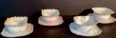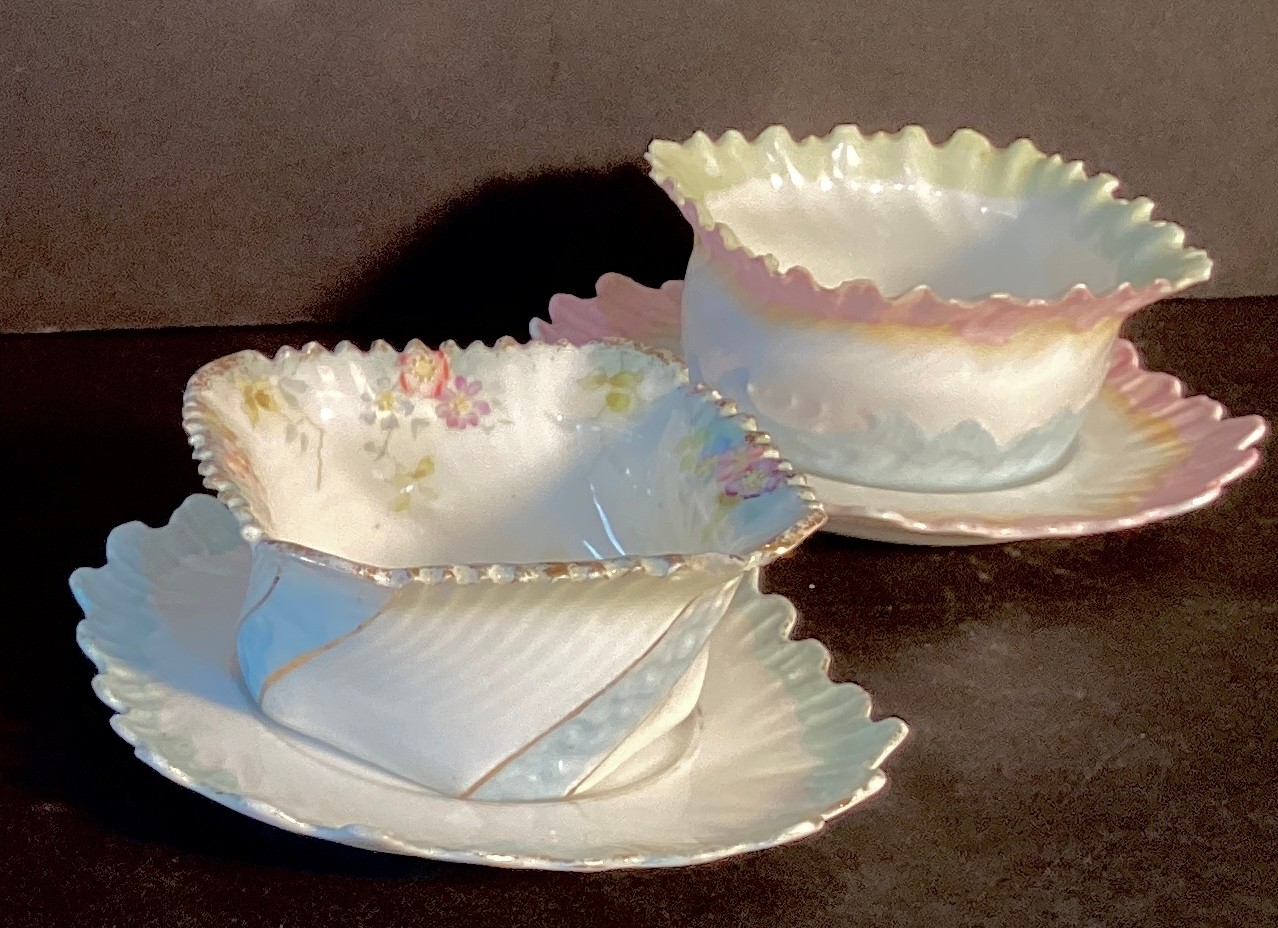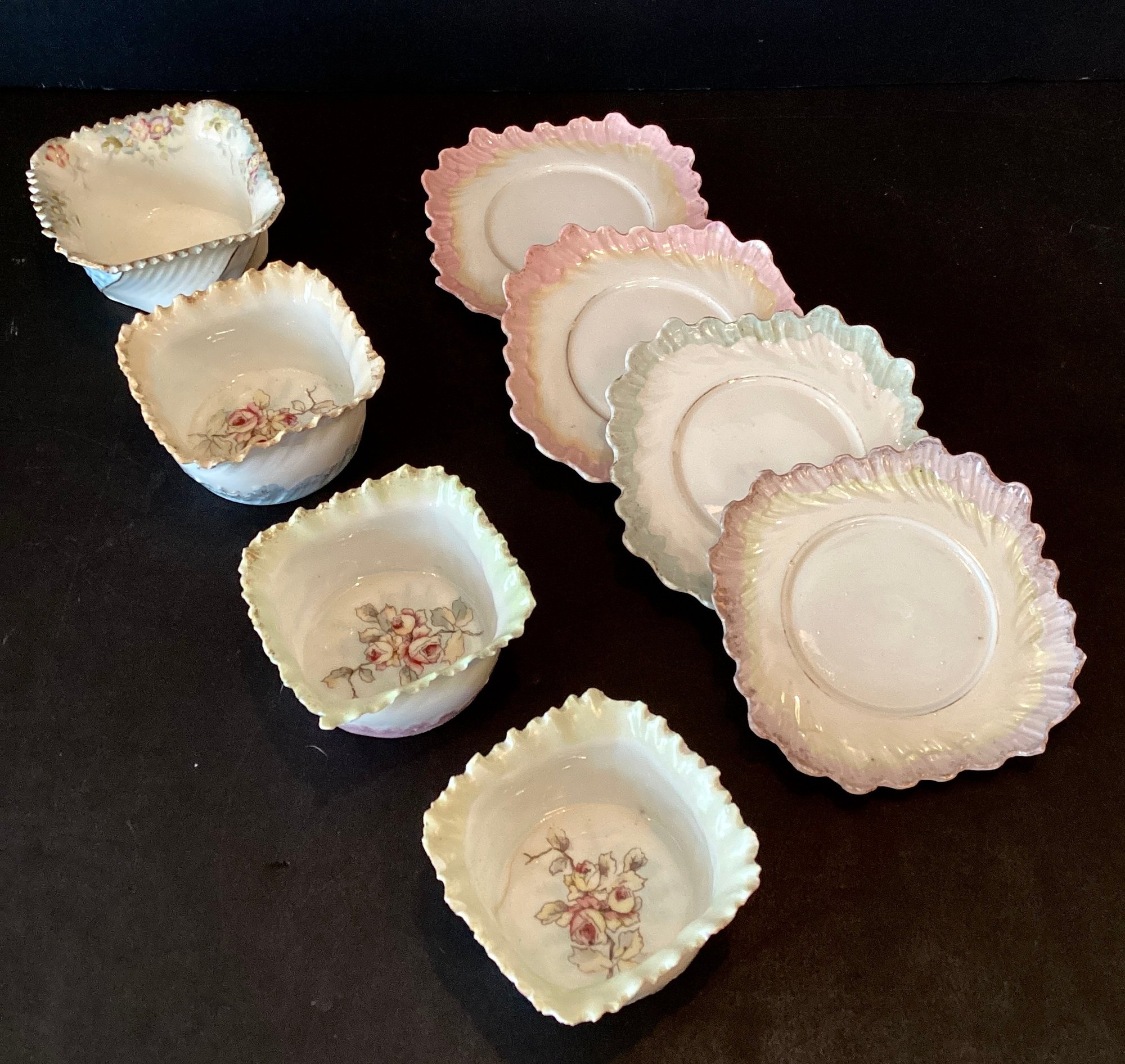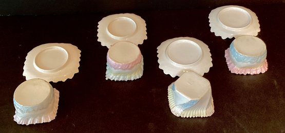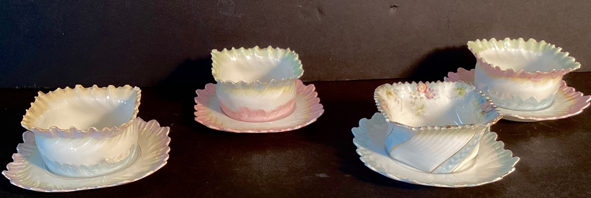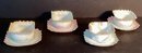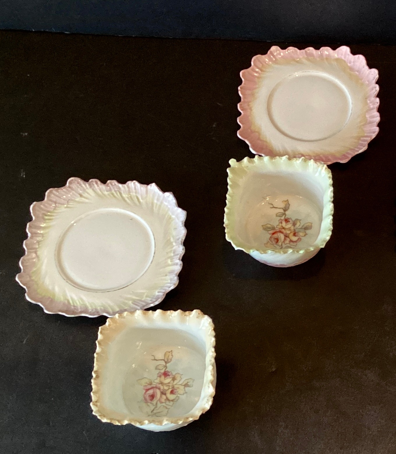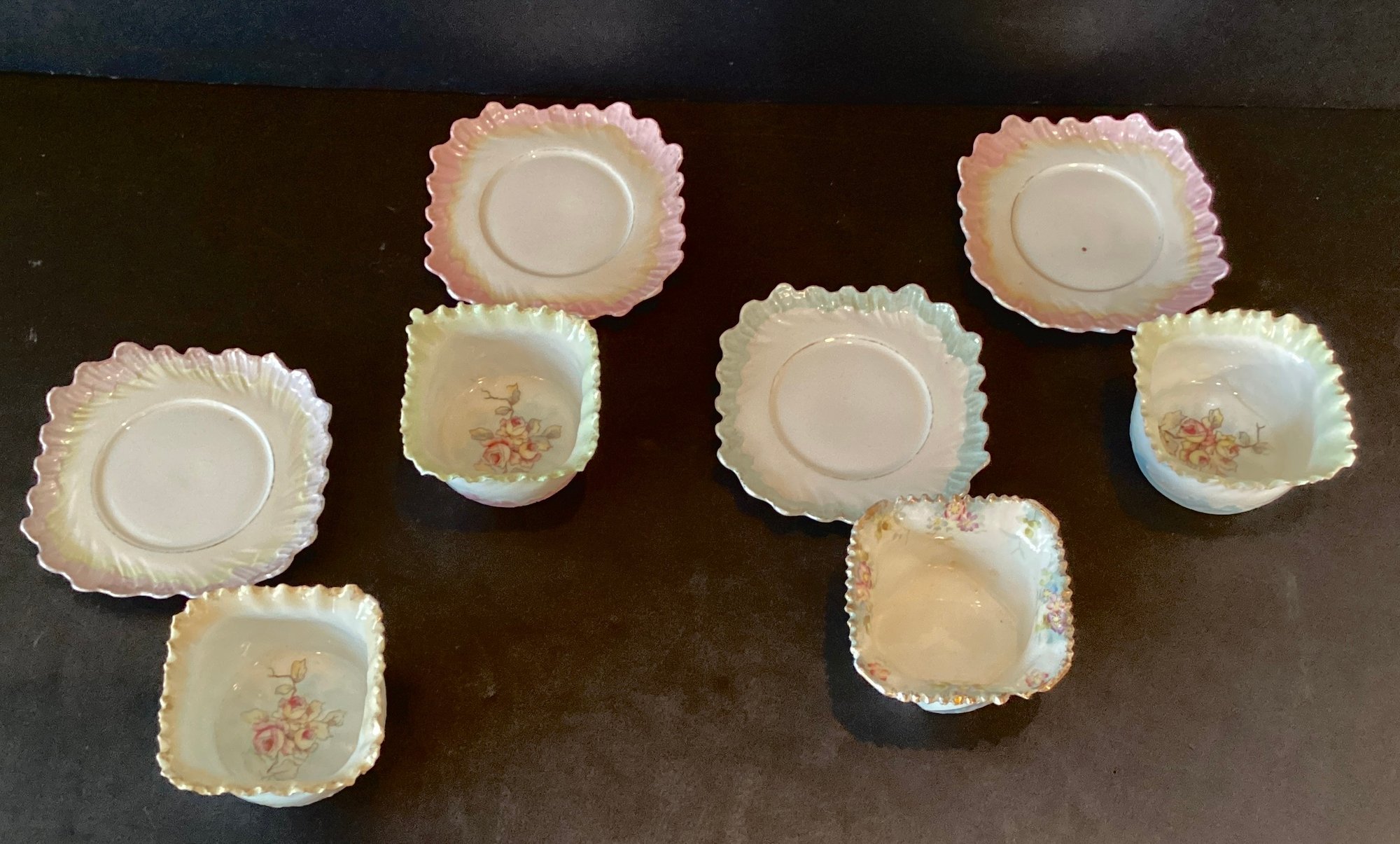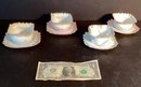 Each dessert cup has delicate ruffled edges, each in a differing pastel shades, three with rose pattern in the dessert cup, and one with hand painted flowers under the ruffled design.