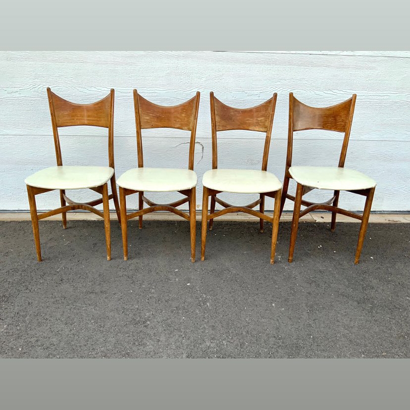4 very strong Mid Century stylish chairs, very useable condition. All original. Naugahyde seats are good and can be reupholstered very easily if you want, chair frames are strong but could use a refinish.
