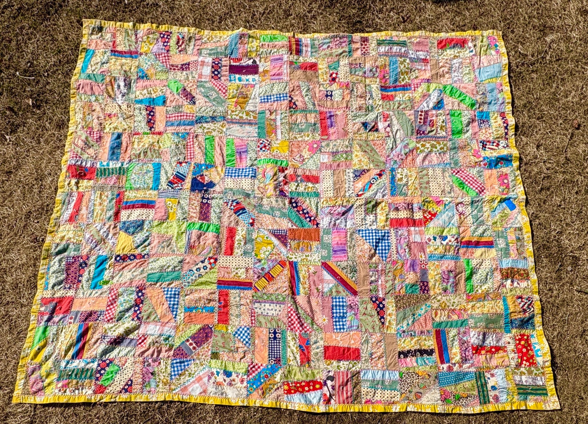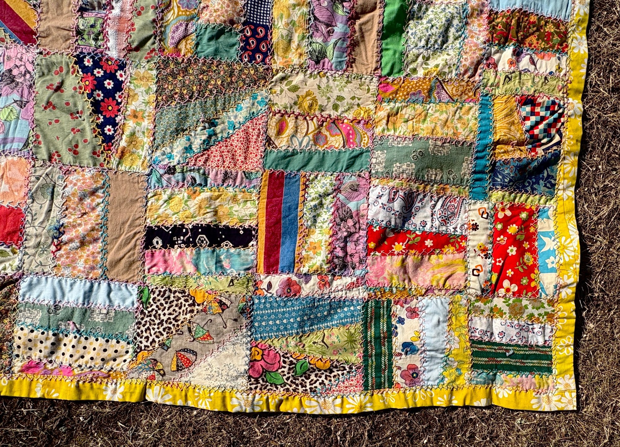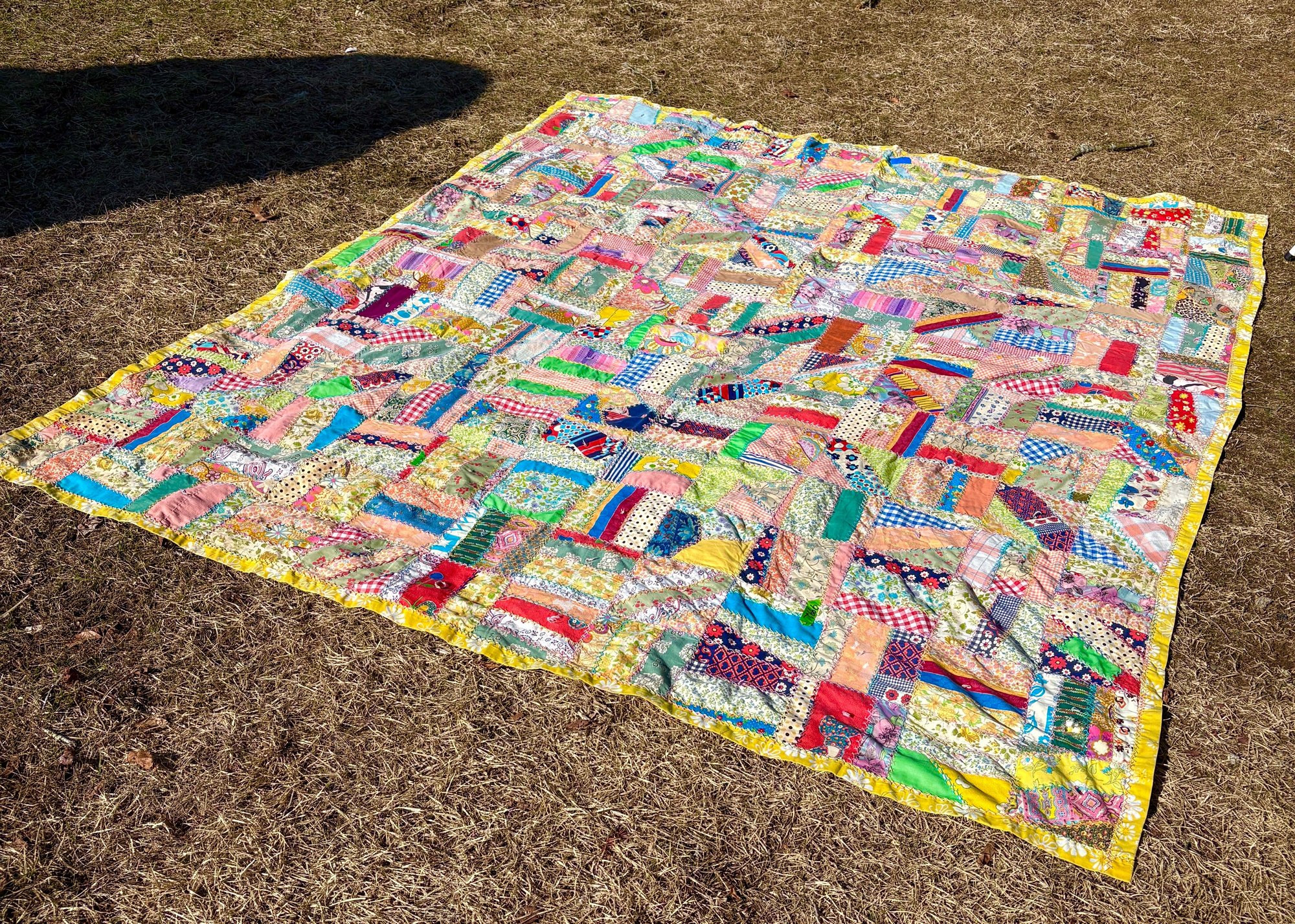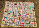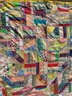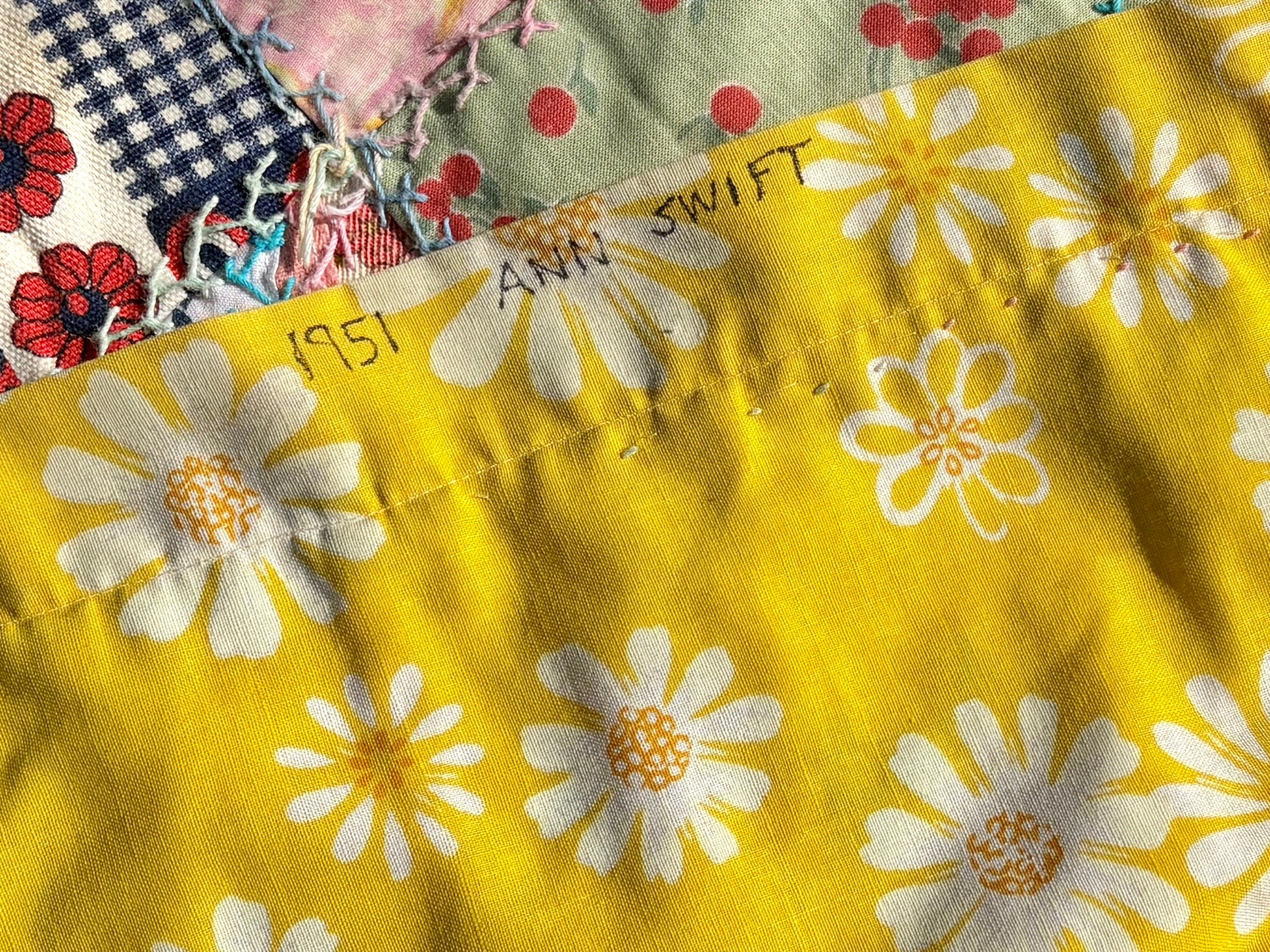 Signed on the back βAnn Swift 1951 β all cotton hand stitched with the interesting fabric of the Mid Century. A few pieces around the edge of minor fraying. Nothing major a very pretty well constructed decorative quilt with interesting fabric pieces in a large size.
