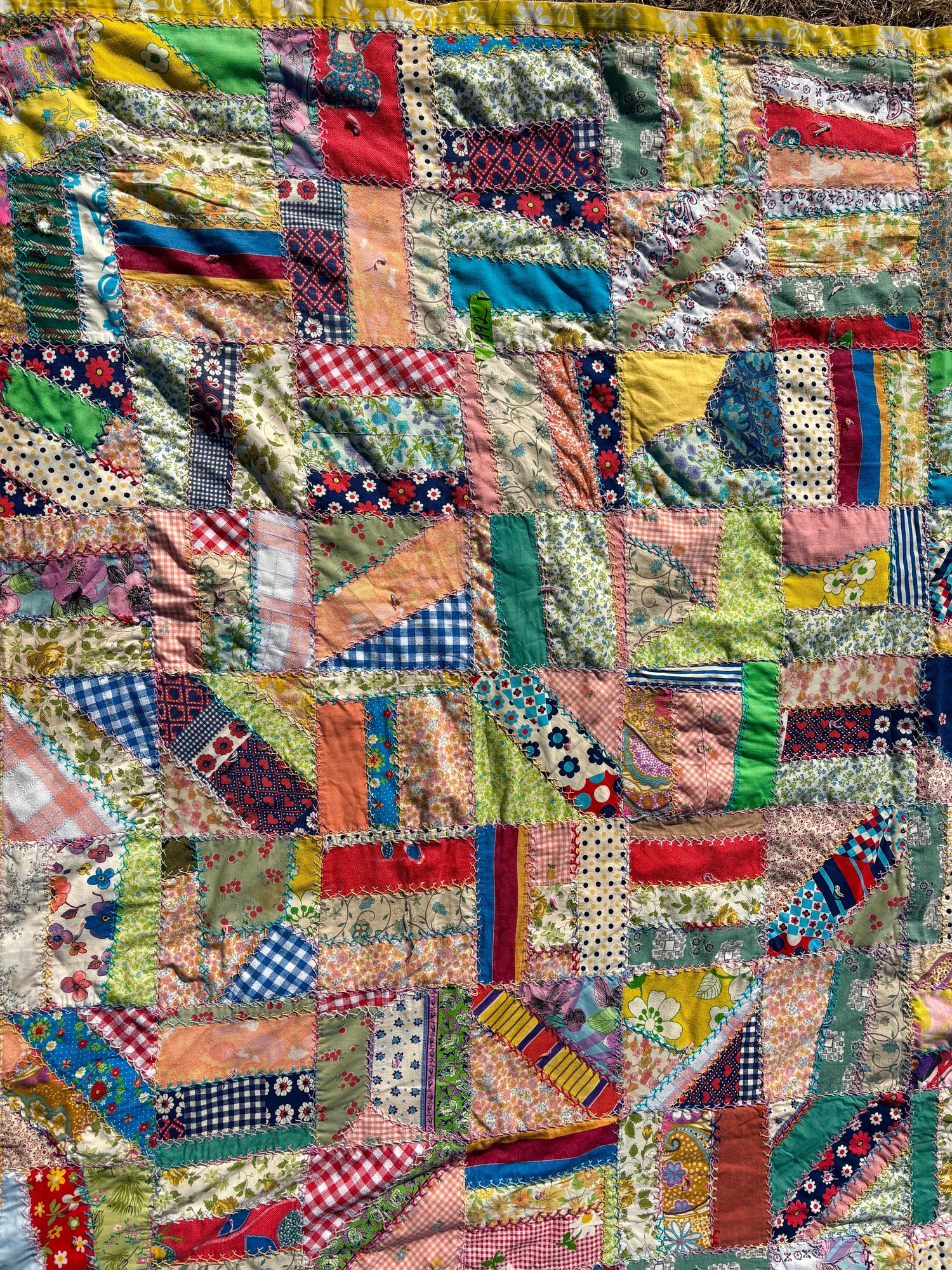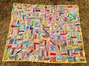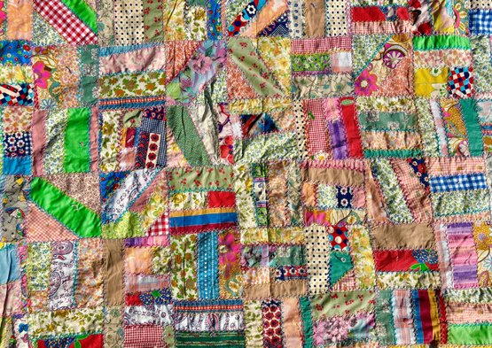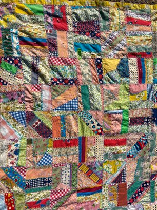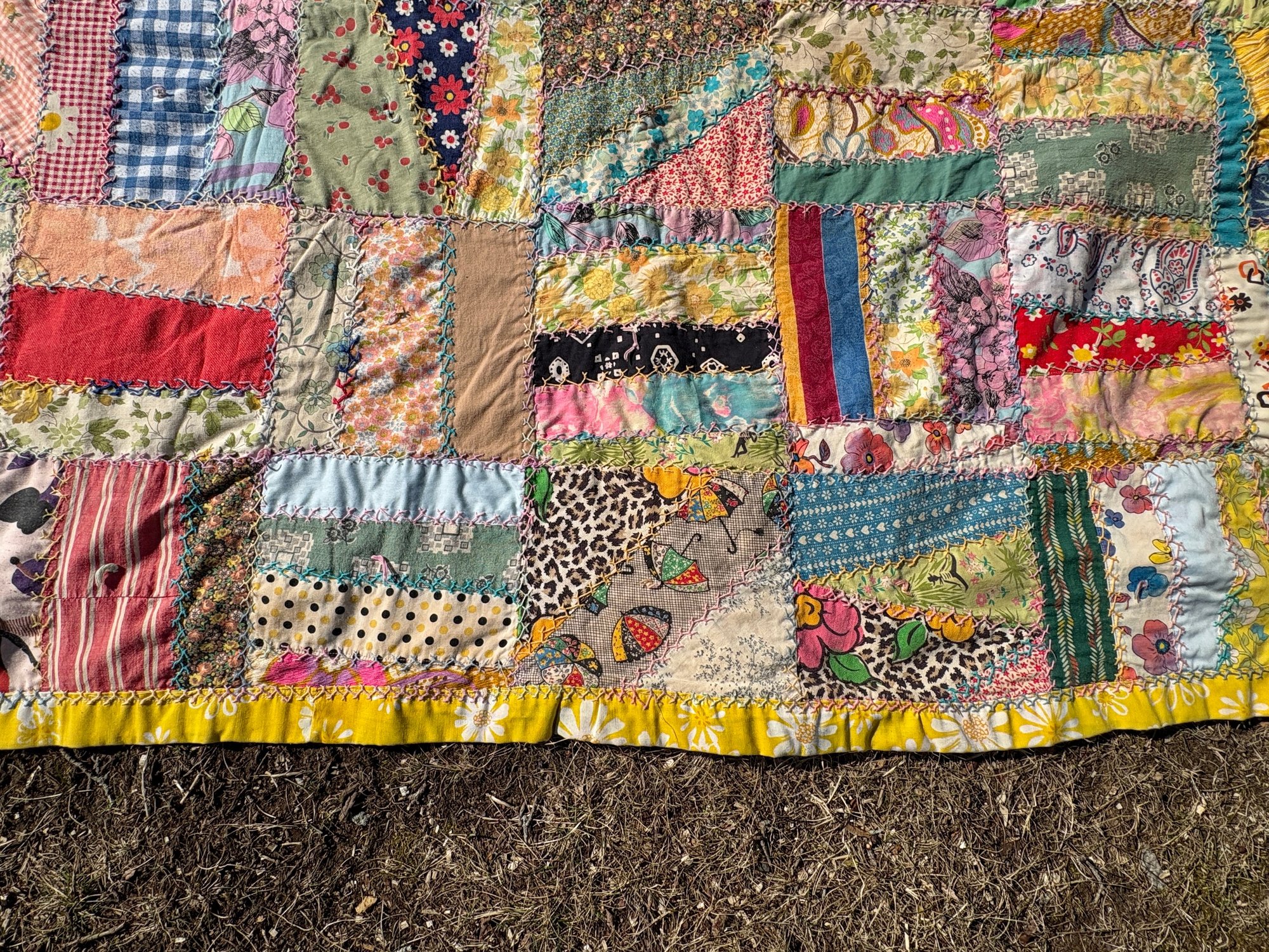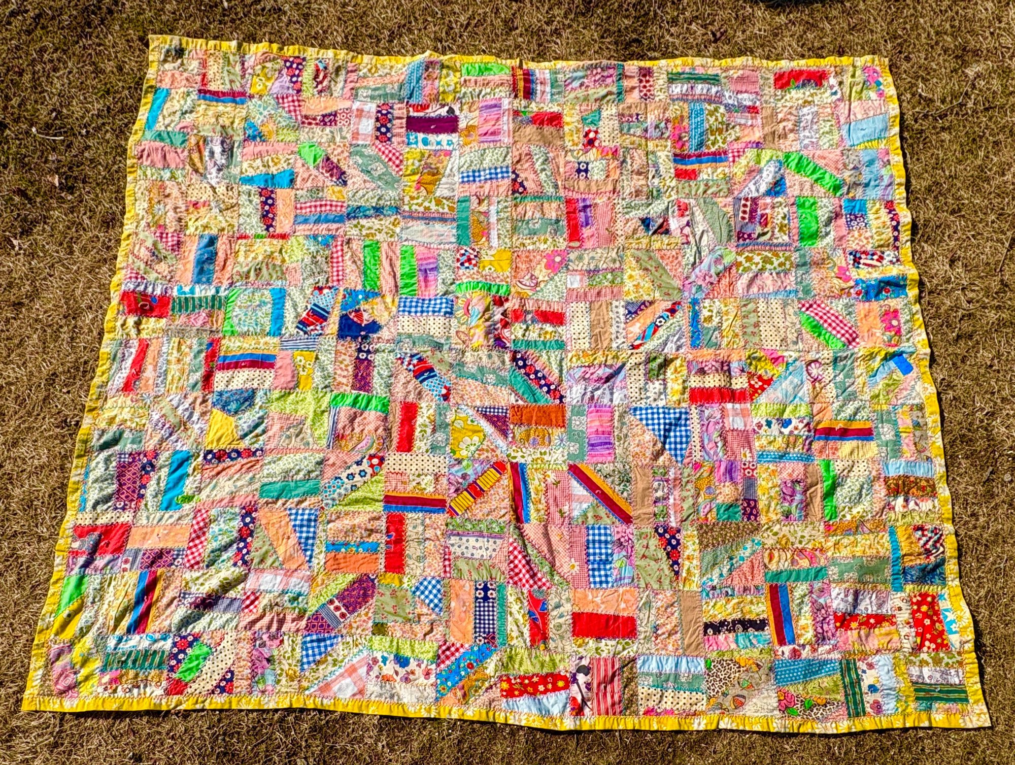 Signed on the back βAnn Swift 1951 β all cotton hand stitched with the interesting fabric of the Mid Century. A few pieces around the edge of minor fraying. Nothing major a very pretty well constructed decorative quilt with interesting fabric pieces in a large size.