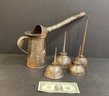 we are selling five nice old antique oil cans. In original condition, no holes no dents age-appropriate wear. 10 can is impressed with the name, Dover.