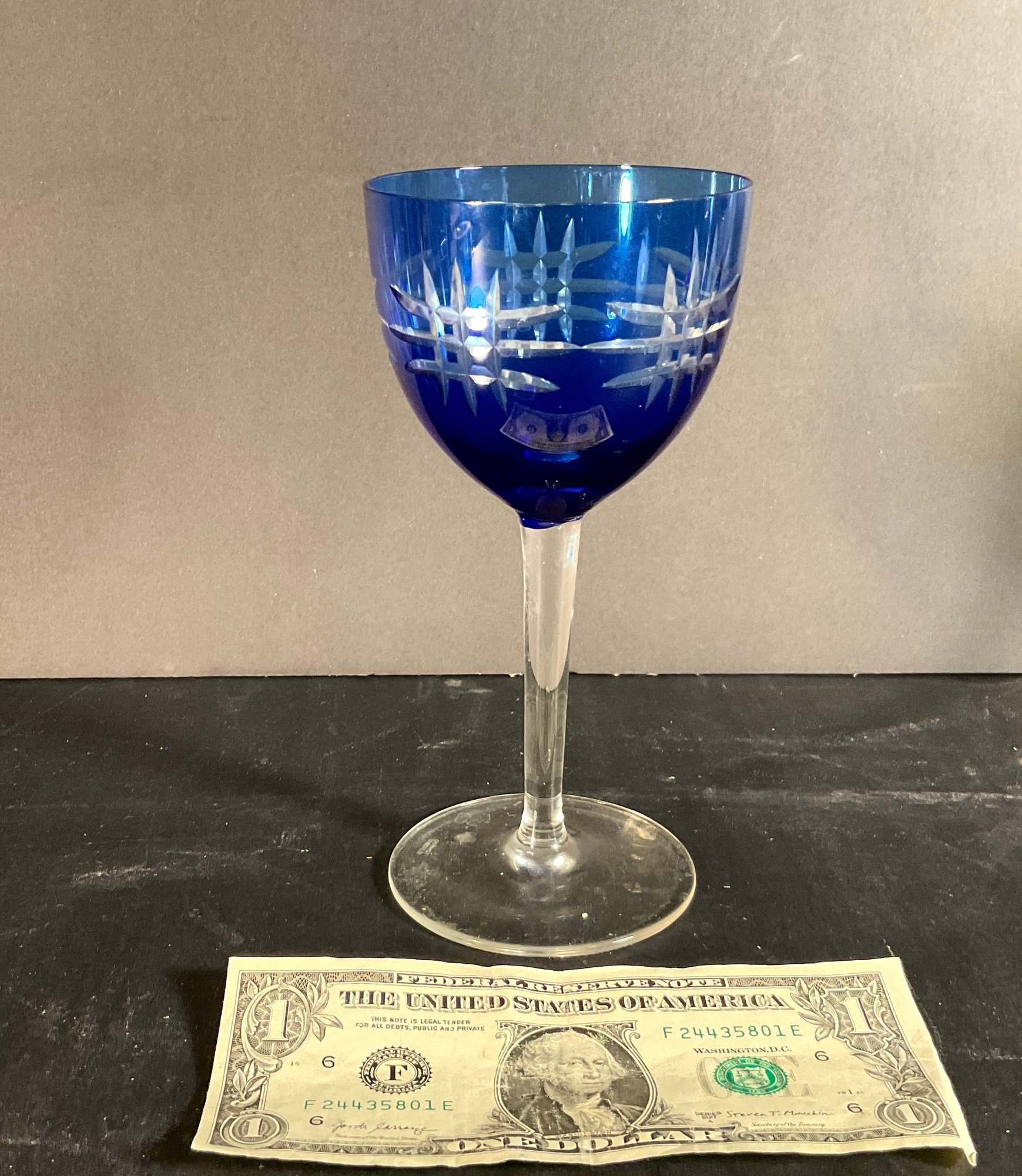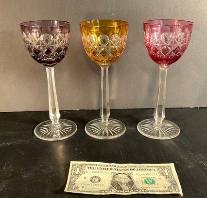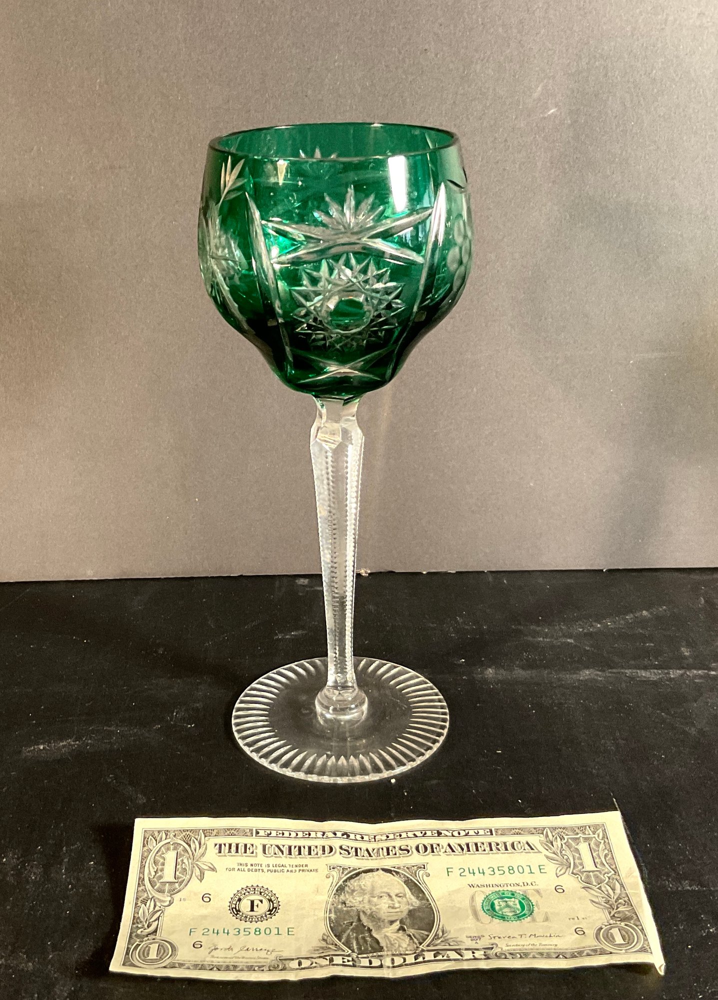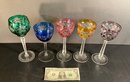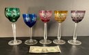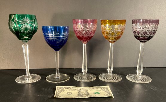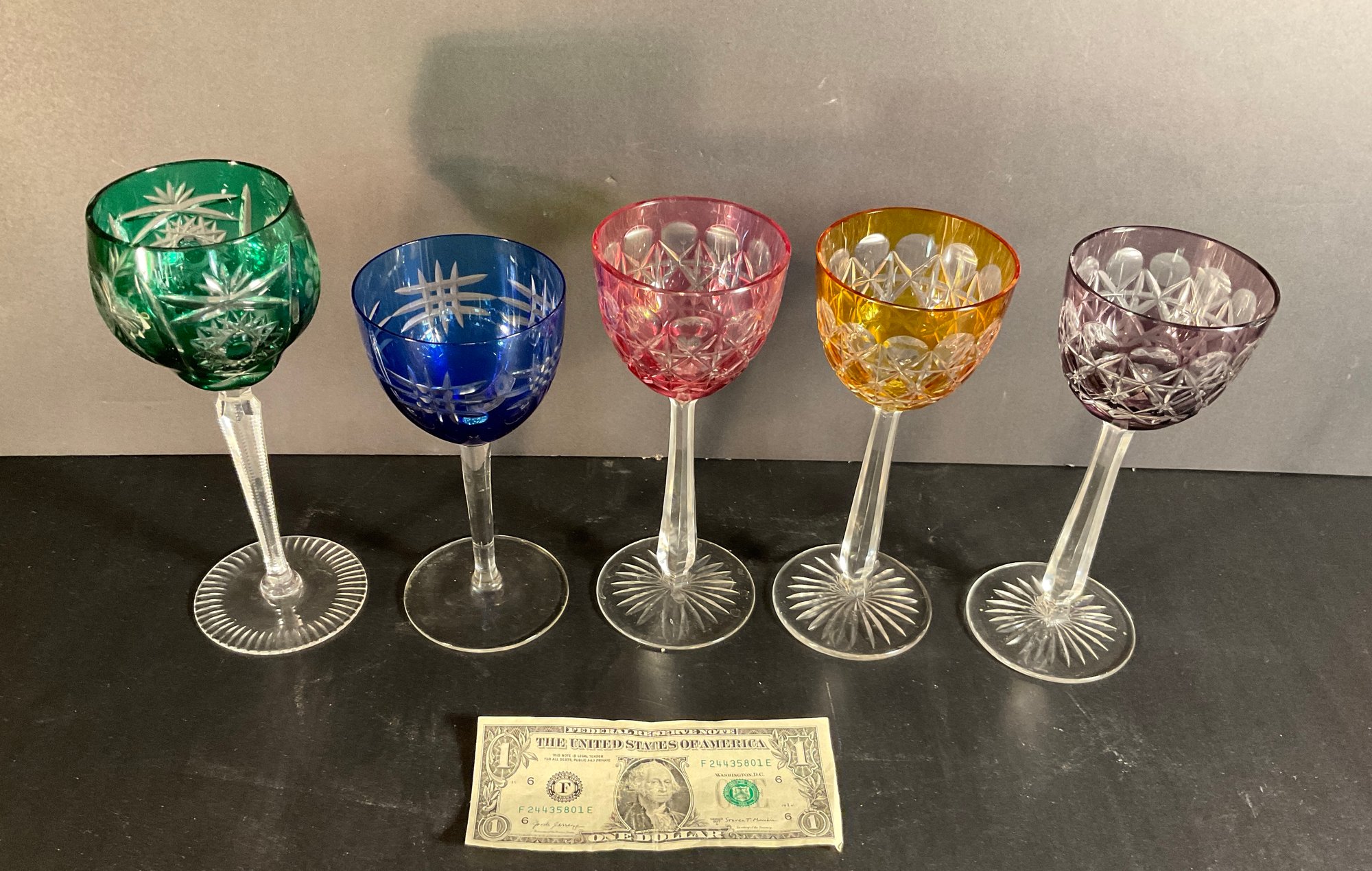 we are selling an assortment of five antique various colors cut to clear wine glasses. All of them are very good quality three of them are matching and design and have various colors. All in very good condition ready to use.