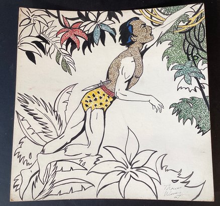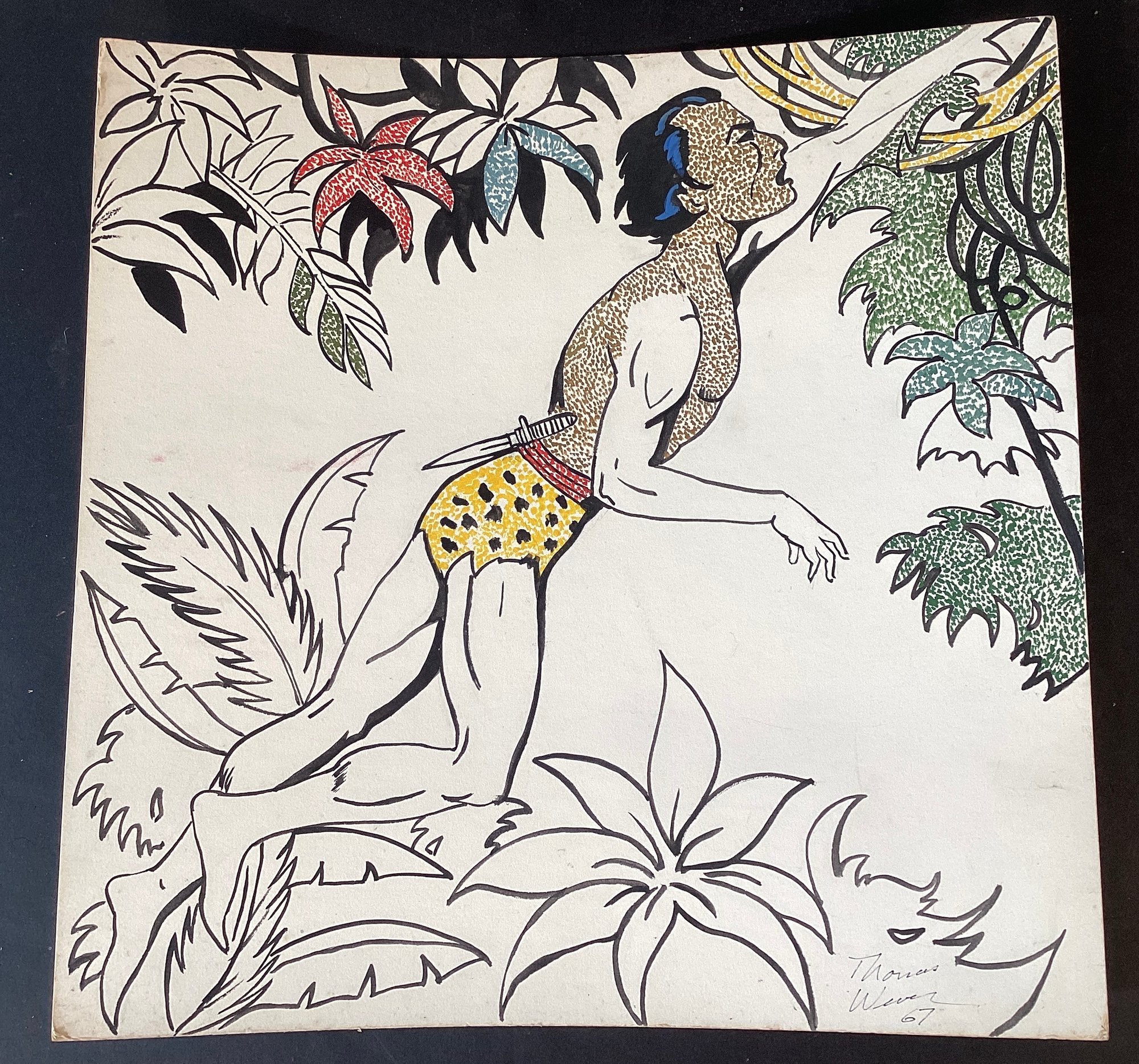 * a 15” x 15” Tarzan on cardboard. This is designed in pen and tempera paint, by Thomas Weaver 1967.