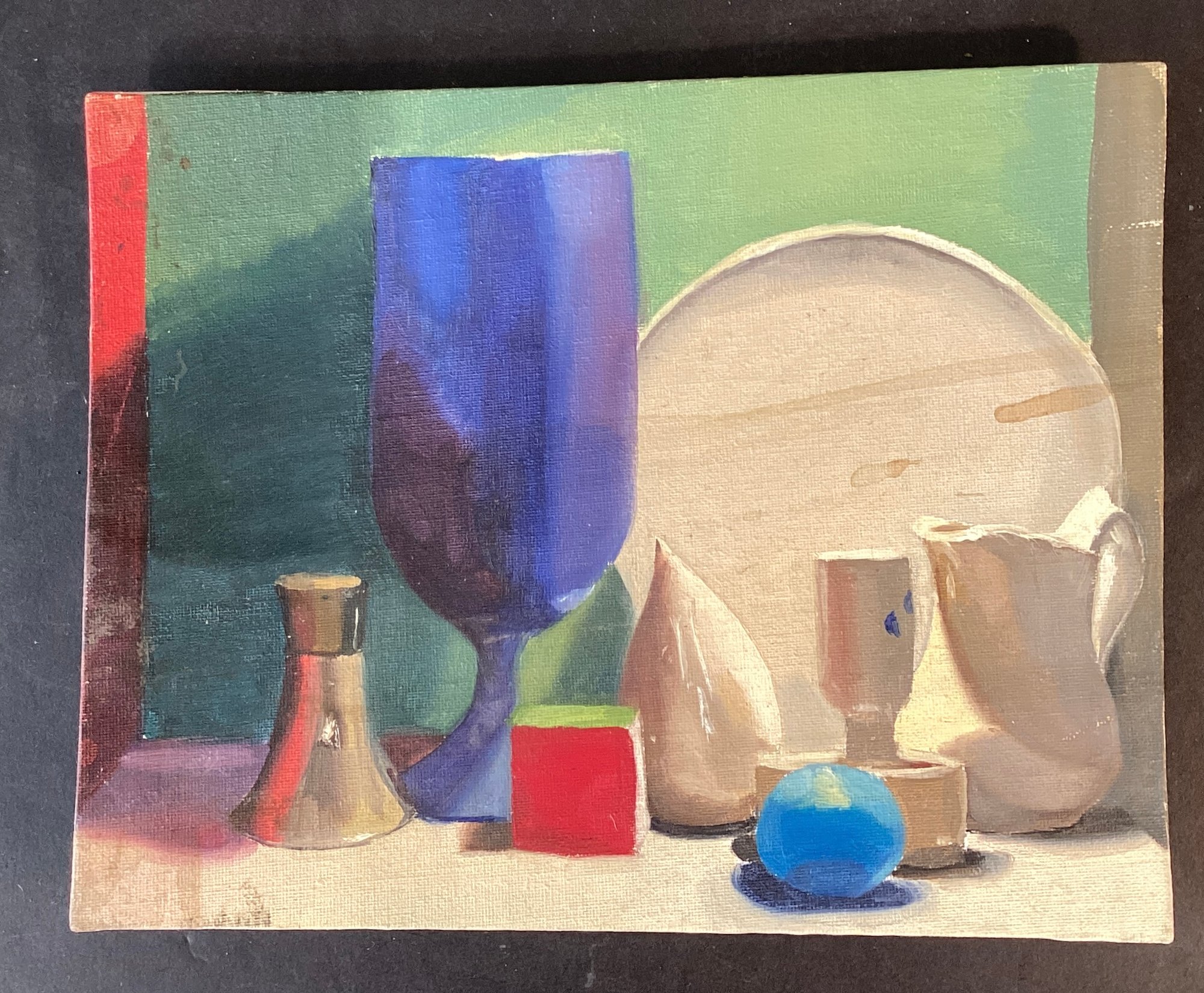 * an 8” x 10 canvas of still life/everyday objects. Painted in tempra, with a small stain to the upper right of the painting. This is not signed.