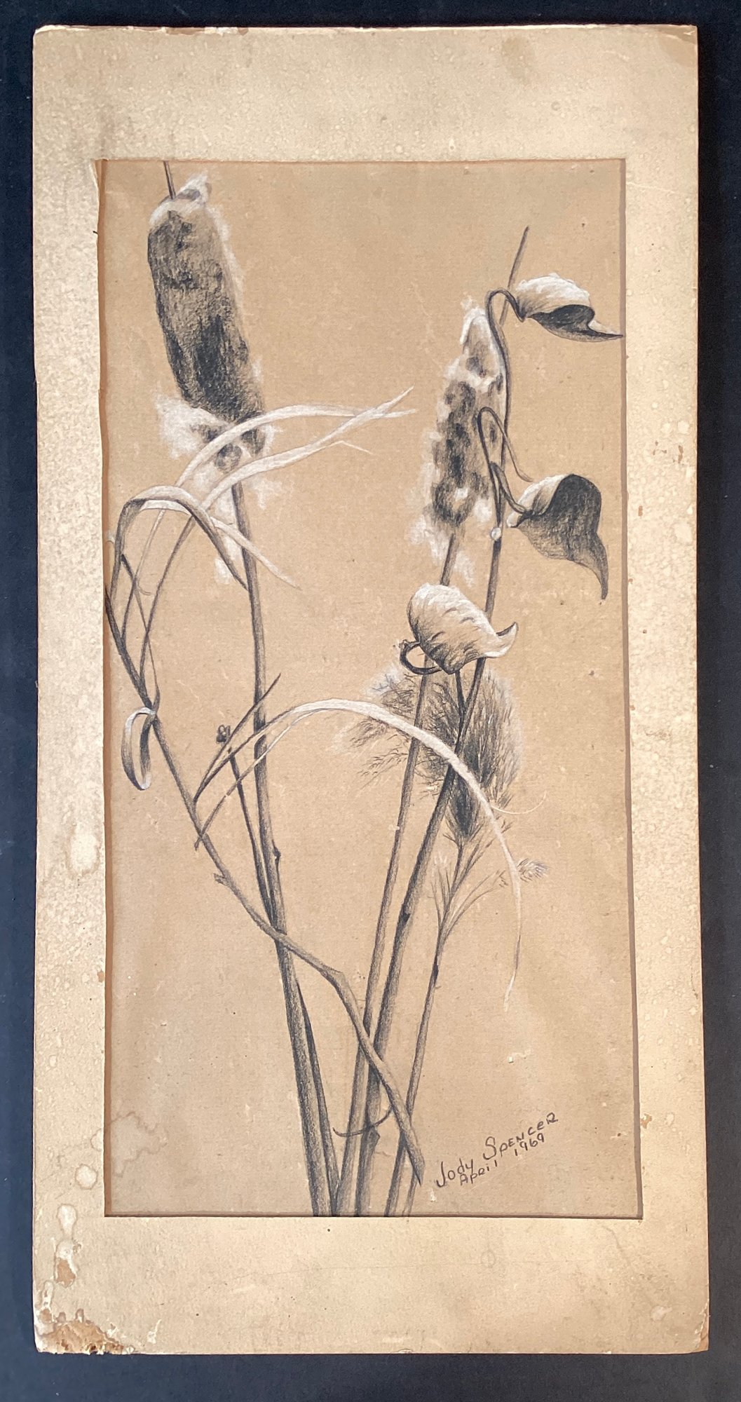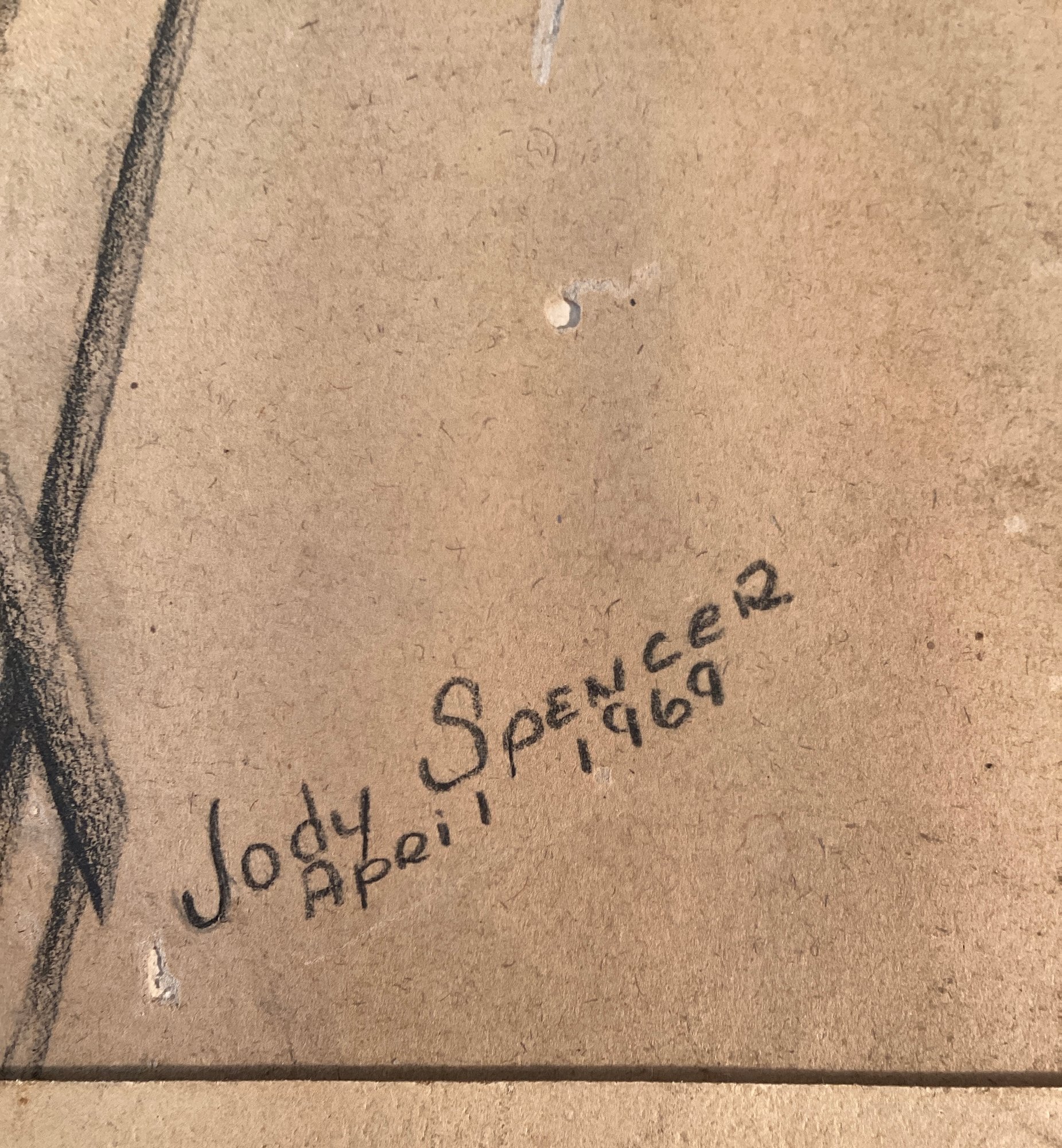 * a 10” x 20” charcoal and pencil drawing on paper this is quasi matted, and adhered to the drawing (by tape). This is signed by Jody Spencer April 1969.