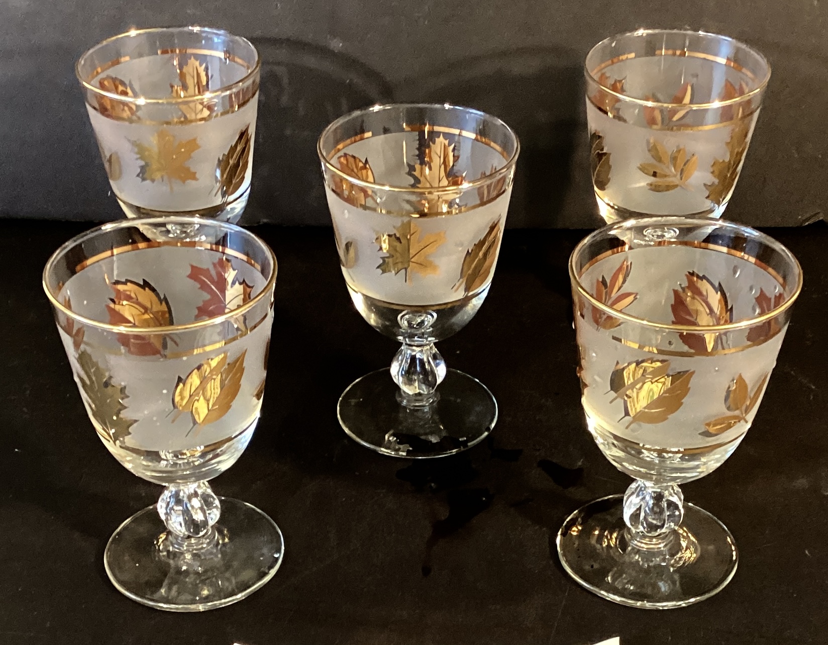 Here are five mid century ‘Golden Foliage’ water goblets by Libbey Glass company.