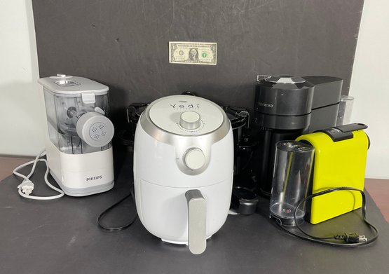 Here we have a group of very nice small kitchen appliances. All the appliances are in good working order, and as you can see, they were kept very clean some seemed not to be used. Included our a Phillips pasta maker, the stainless steel, crockpot, yeti air fryer, and two Nespresso machines.
