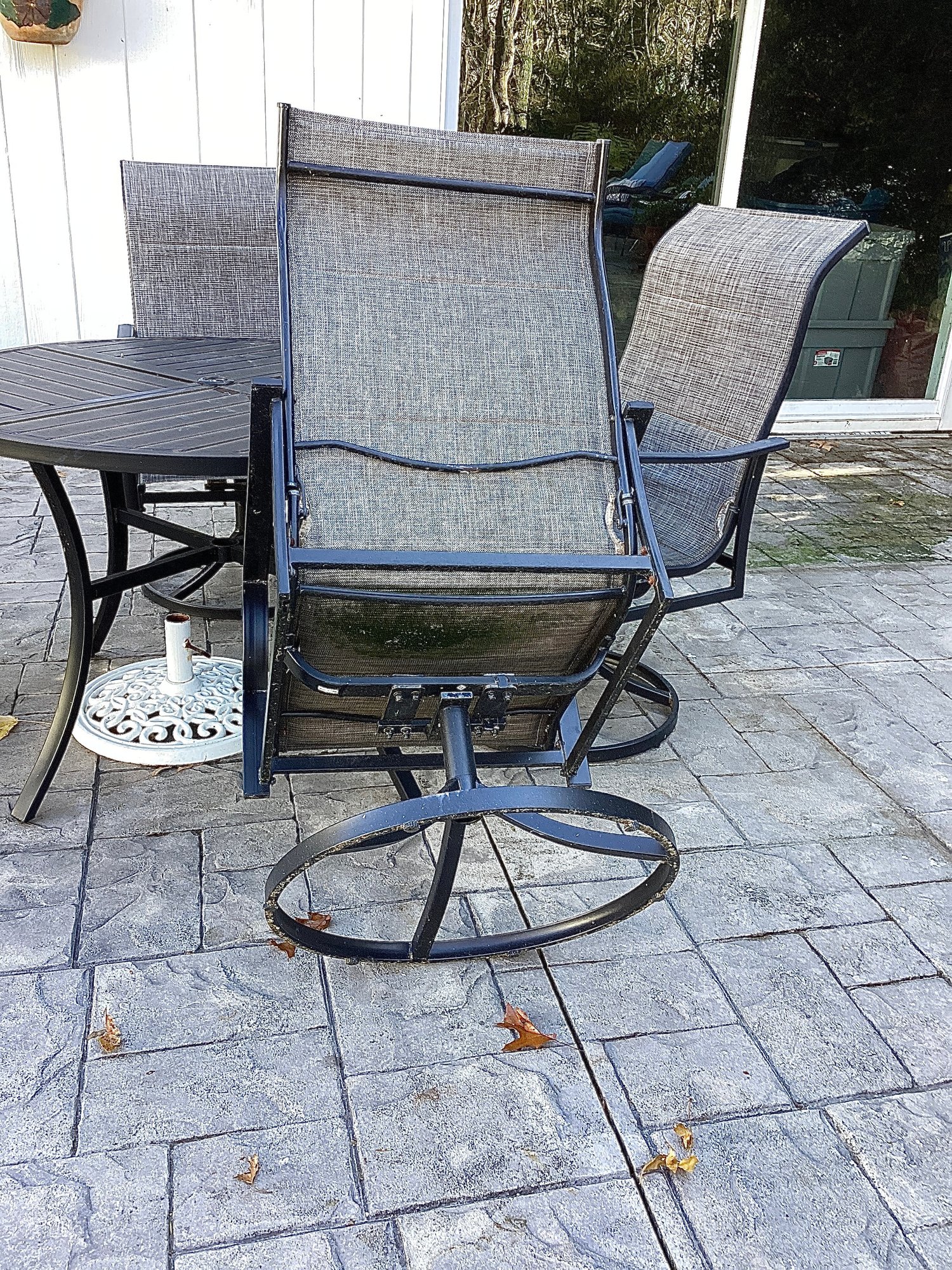 Here we have a very useful five piece patio set with four generous swiveling chairs. there is some evidence of paint loss on the table. A little touchup paint would fix it easily. The chairs are all working in good condition ready to use.