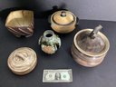 * A covered pot in a warm earth tone glaze with touches of black and measures approximately 6.00” in height and has a diameter of approximately 5.00”.