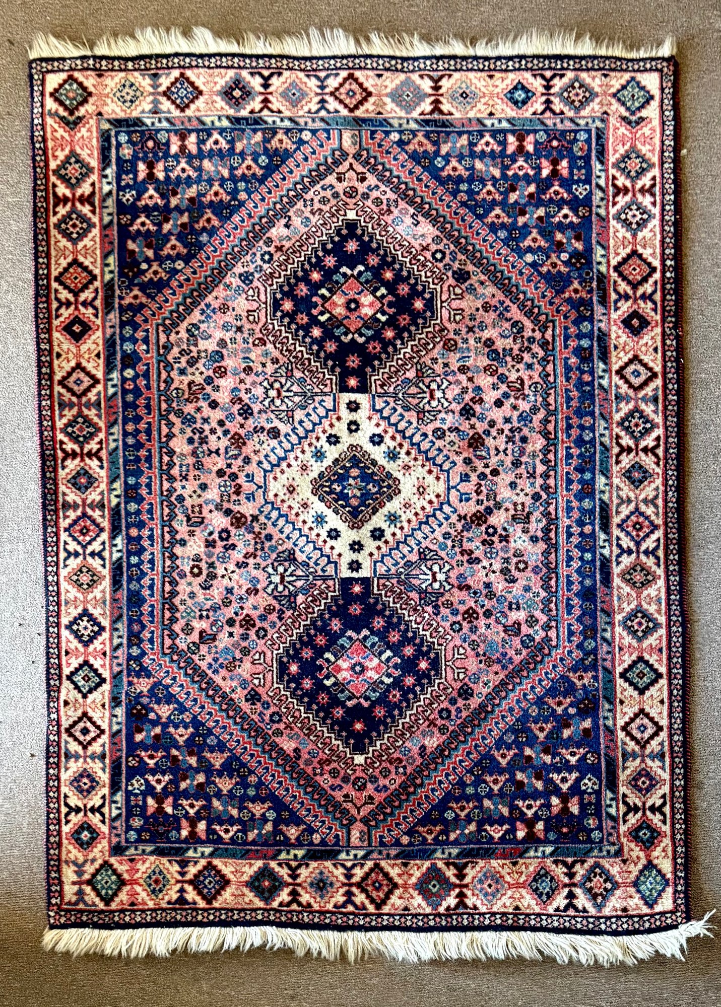 This rug will wear like iron. Probably made in the late 30s. It shows no sign of ware or just coloration. The pile is thick and rich. The borders are clean and the design is strong and colorful. Handmade in Iran. Everything you would want in a rug.