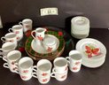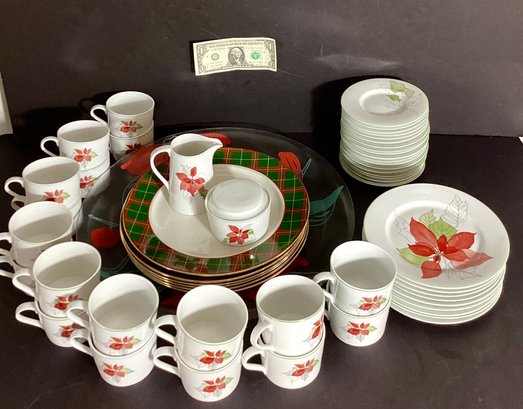 The group includes a large glass cookie platter, dinner plates in a festive tartan design, white poinsettia sauces which could also be used as bread plates, red poinsettia salad or dessert plates, and poinsettia designed cups.