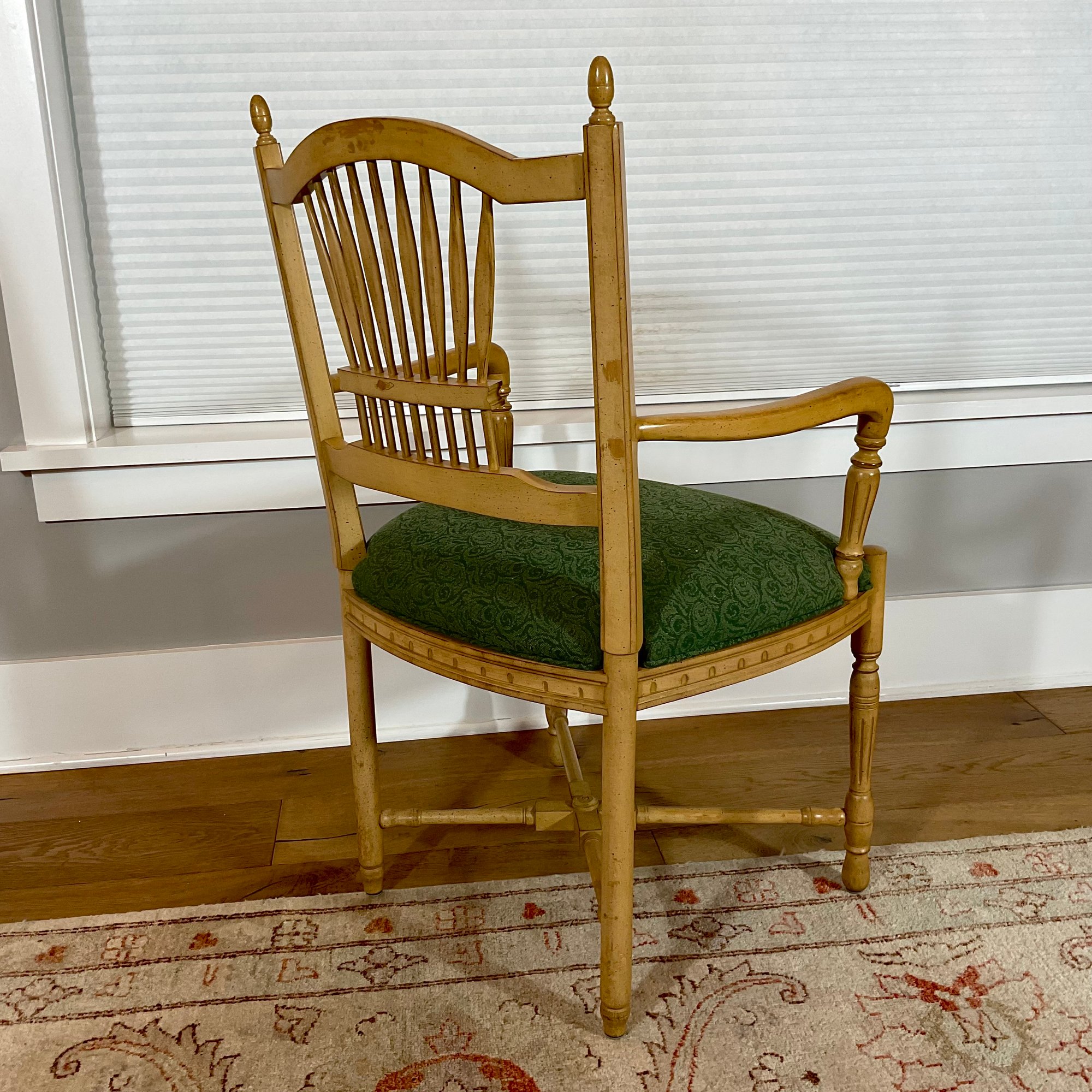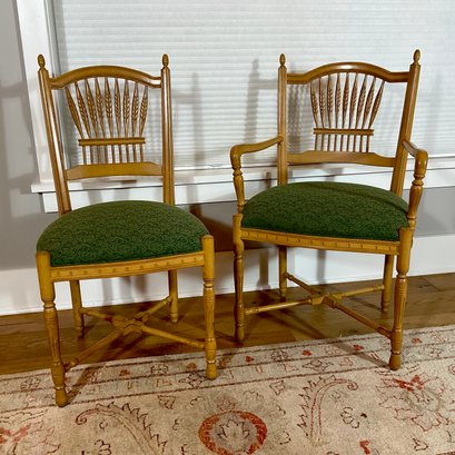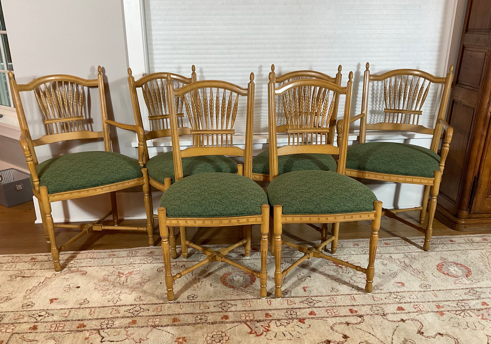 we are selling six French style dining chairs that have upholstered seats. There are two armchairs and four side chairs all of which are in very good usable condition. Ready for your home.