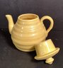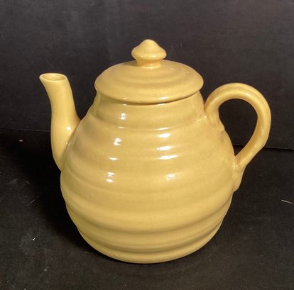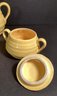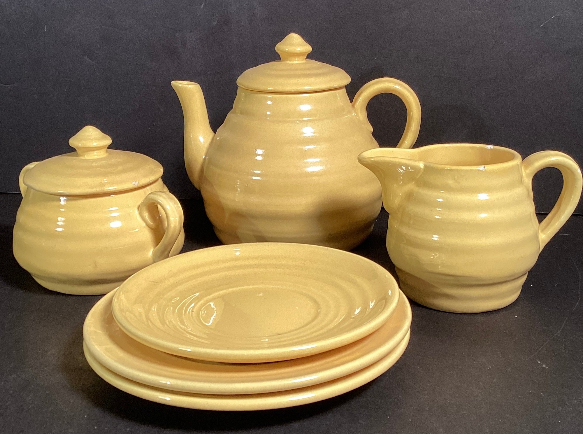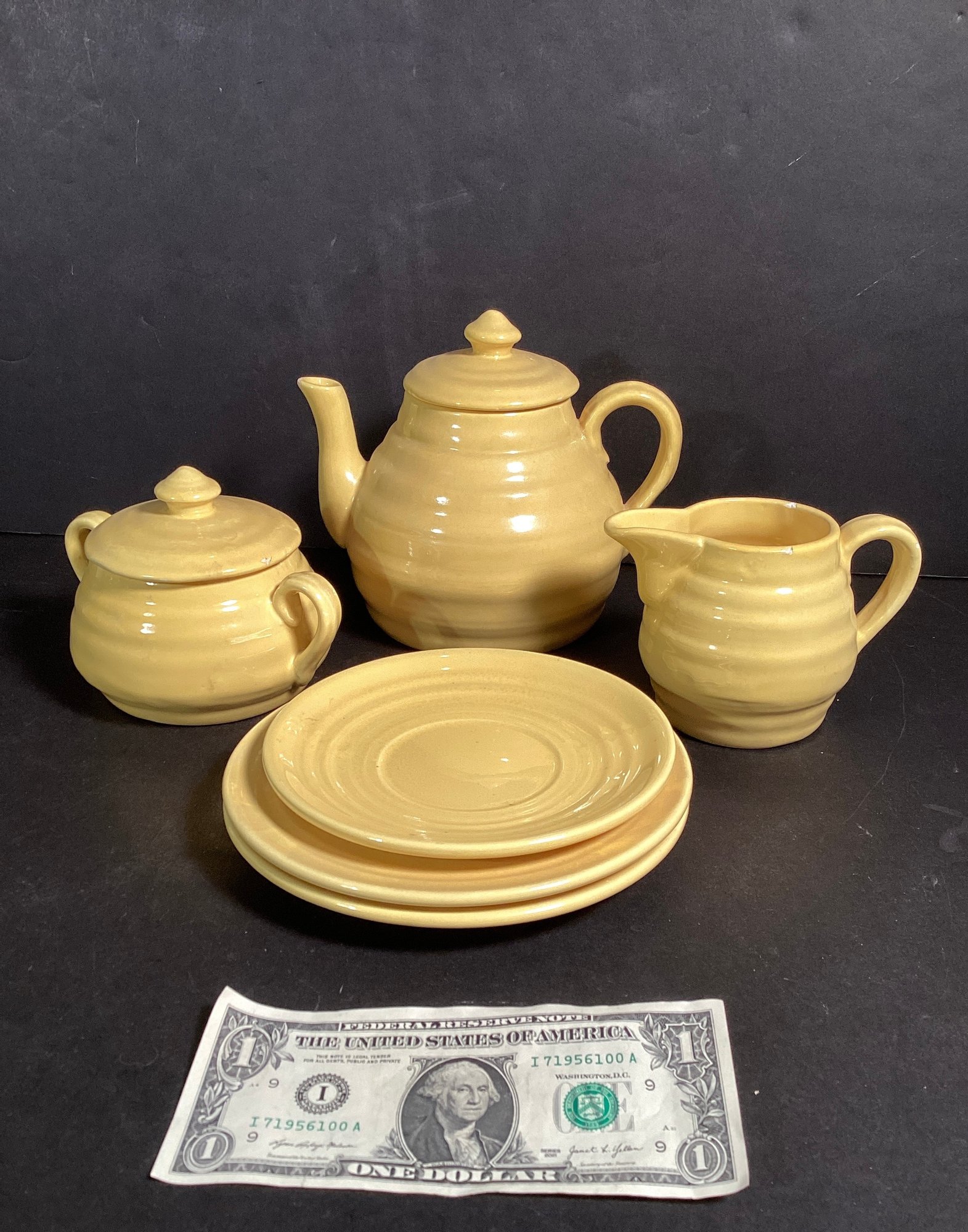 Here we have a nice six piece set of vintage pottery for your collection. This includes a teapot with lid ( 6.5”), a creamer, sugar bowl with lid, and three plates.