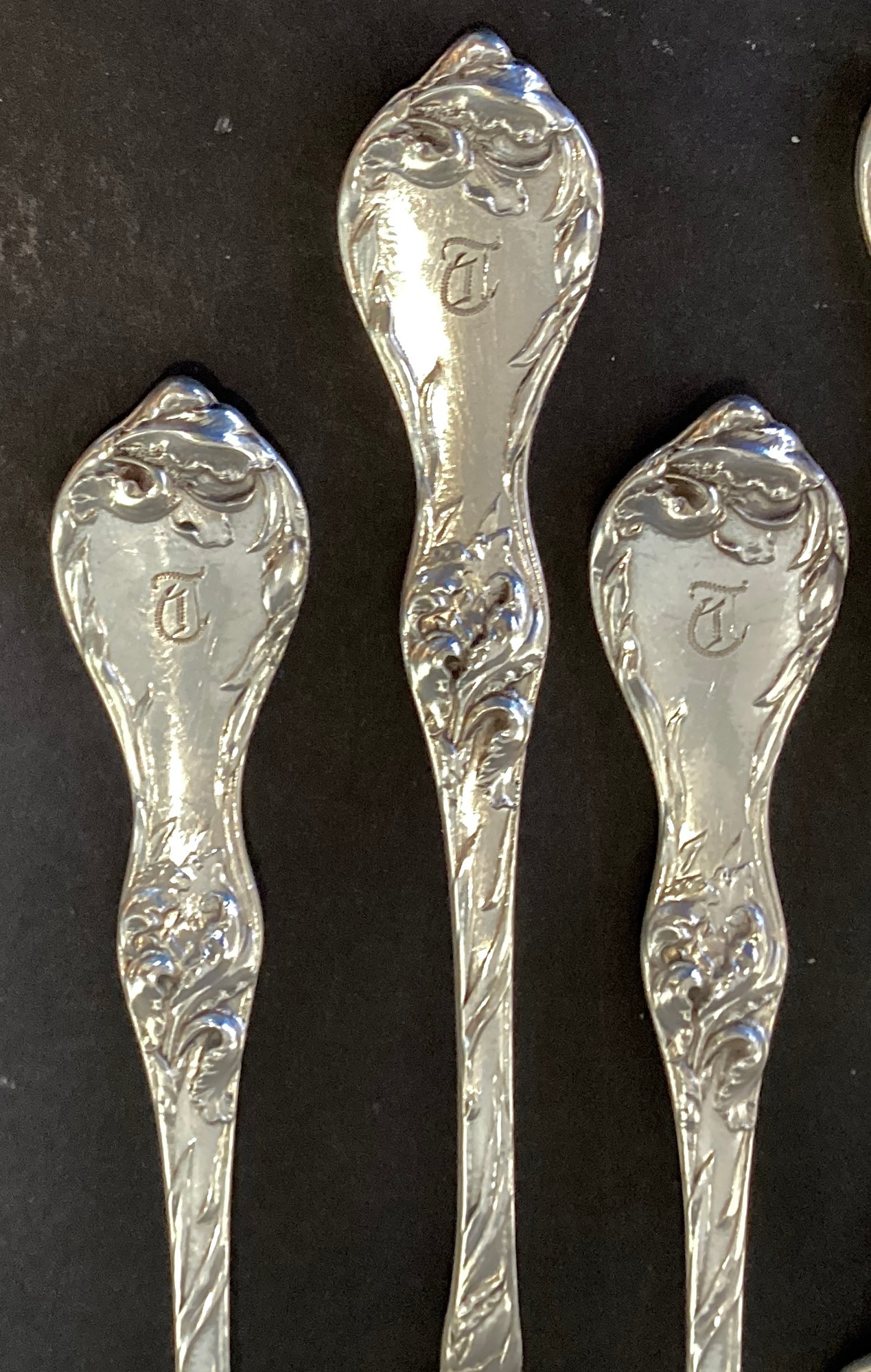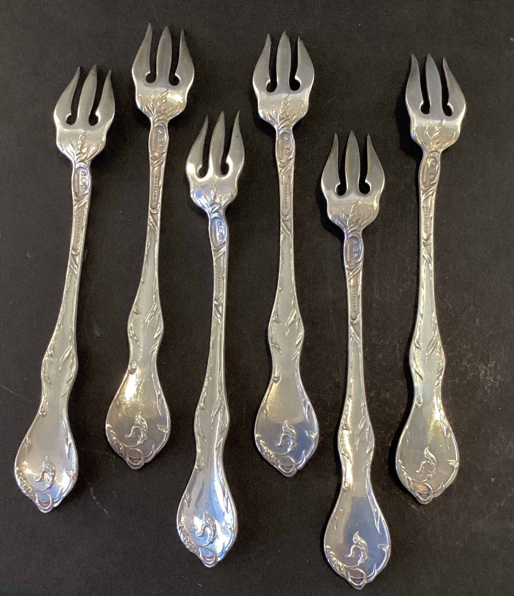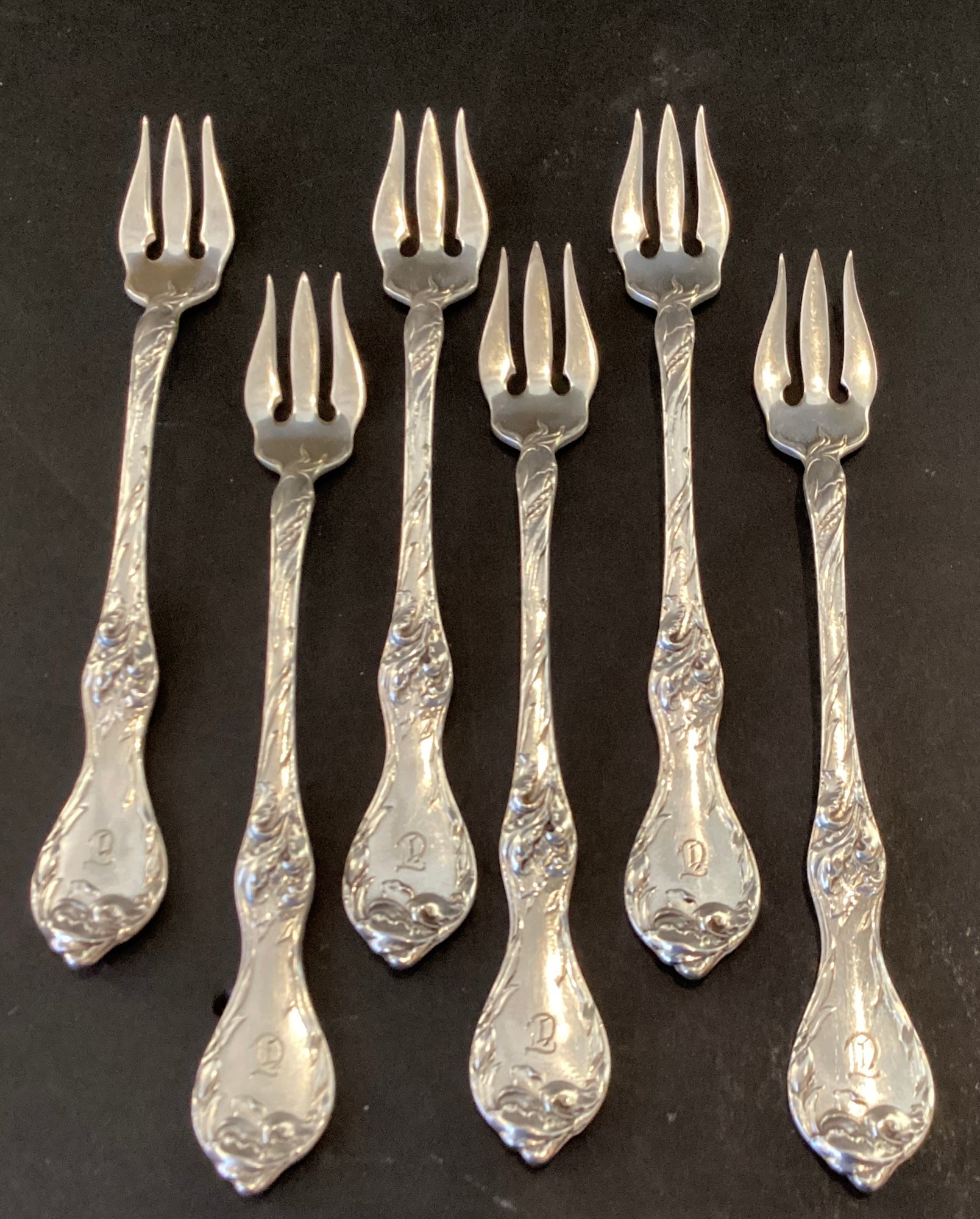 Here we have 6 antique baroque style Reed and Barton oyster forks.
