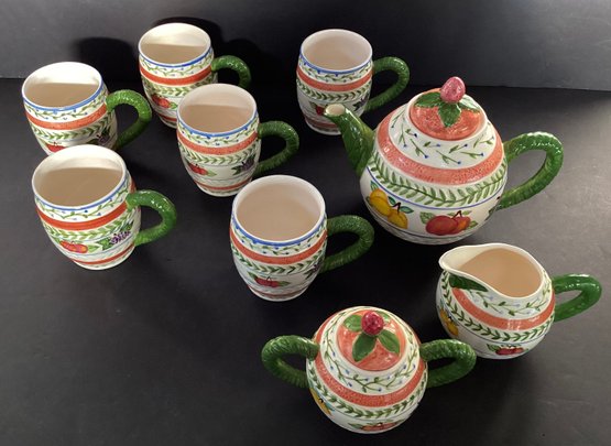 * The teapot depicts various fruit designs and measures approximately 9” in height and 7” in diameter.
