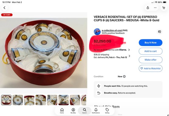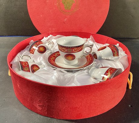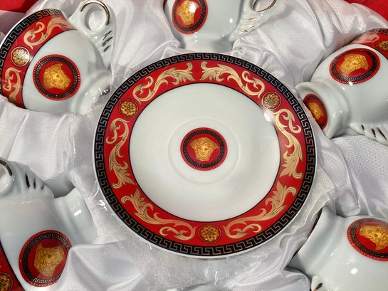 New old inventory, rare pattern. Original box.Each cup and saucer are in excellent condition. have not been used., measurements . 4.5” diameter, cup is 3.5”tall, 2.5” diameter.